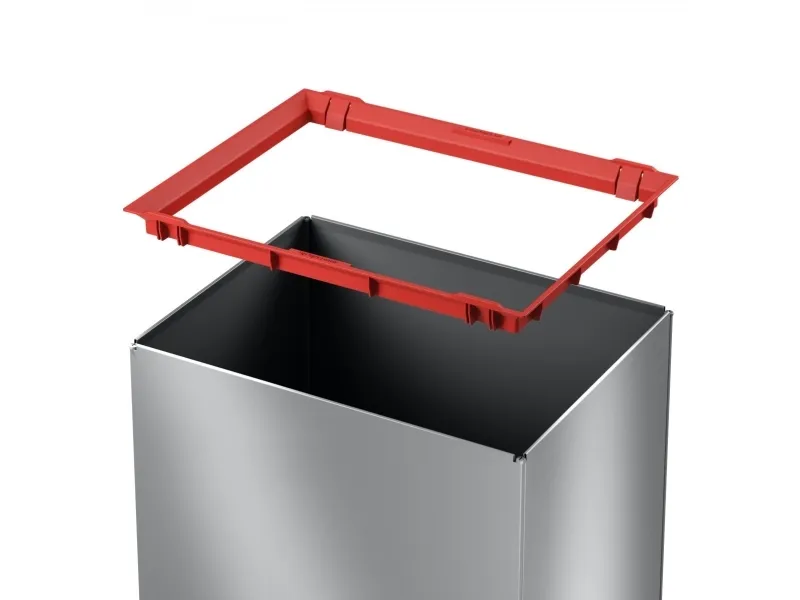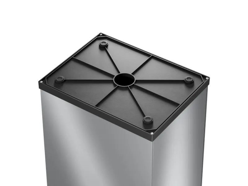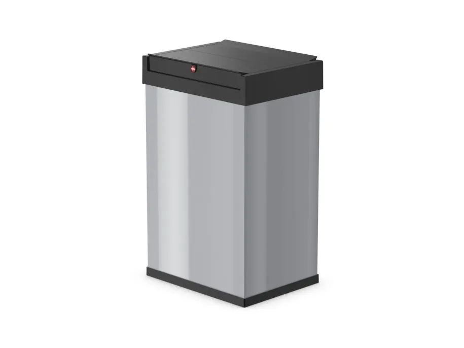 Storrumskasse Bix-Box Swing L. Med selvlukkende drejelåg · svinglåg til en permanent åbning · med klemmeindklemningsrammer · 4 skridsikre fødder · firkant-hus af korrosionsfast belagt stålplade · låg og bund af slagfast plast · fladt pakket, men hurtigt samlet.