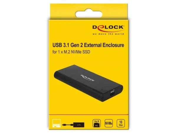 This enclosure by Delock enables the installation of an M.2 PCIe NVMe SSD in 2280, 2260 and 2242 format, it can be connected via USB to the PC or laptop. The robust metal housing ensures an optimum temperature of the memory.