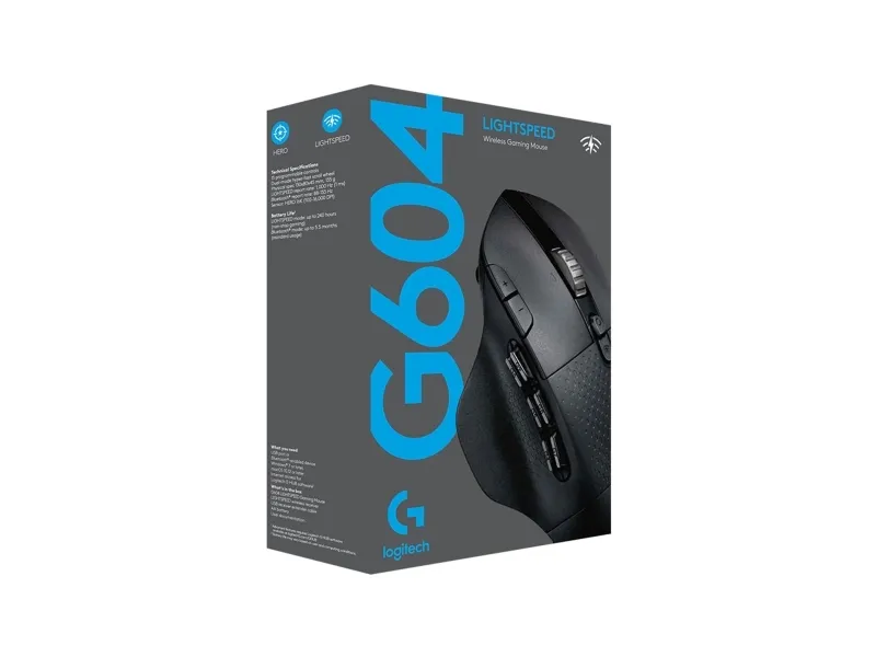PLAY WITH MASTERY With 15 programmable controls, LIGHTSPEED wireless technology, a hyper-fast scroll wheel and the revolutionary HERO 16K sensor, G604 oers both versatility and high-performance with endless possibilities. Master your arsenal in tactical game genres like Battle Royale, MMO and MOBA with a just-right quantity and conguration of customisable buttons. Dual connectivity lets you toggle between Bluetooth® and ultra-fast 1 ms LIGHTSPEED advanced wireless technology – even on separate machines. Switch scrolling modes at will to y through menus, ratchet through weapon or spell selections. Extremely accurate tracking and class-leading power eciency enables up to 240 hours of high-performance gaming with one AA battery. Play with mastery.