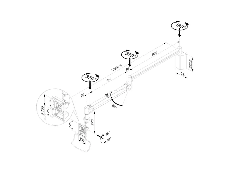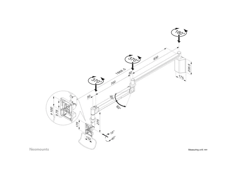 The Neomounts wall mount, model FPMA-HAW100HC is a tilt and swivel wall mount for medical flat screens up to 32". This mount is a great choice for space-saving placement or when ceiling mounting and floor placement is not an option. Neomounts unique tilt (55°) and swivel (370°) technology allows the mount to change to any viewing angle to fully benefit from the capabilities of the flat screen. The support is easily height-adjustable from 0 to 170 centimeters using a gas spring. Depth-adjustable from 0 to 170 centimeters. An innovative cable management conceals and routes cables from mount to flat screen. Hide your cables to keep the workplace nice and tidy. Neomounts FPMA-HAW100HC has two pivot points and is suitable for screens up to 32" (81 cm). The weight capacity of this product is 6 - 12 kg each screen. The ceiling mount is suitable for screens that meetVESA hole pattern 75x75 or 100x100mm. All installation material is included with the product.