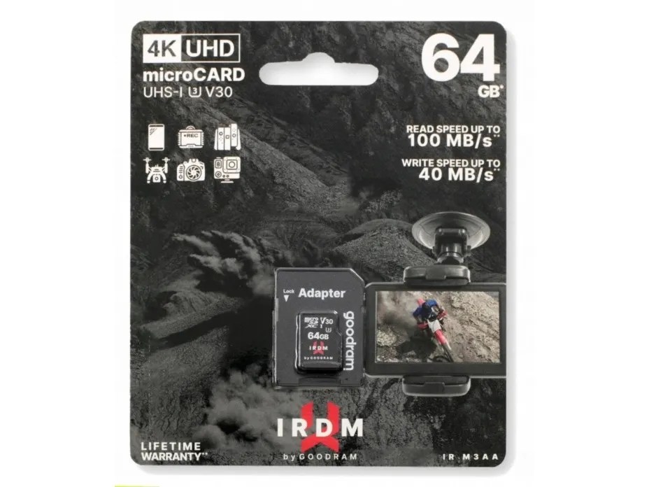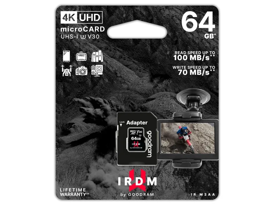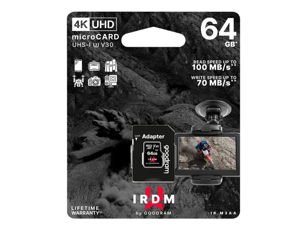 IRDM UHS-I U3 microCARD brings high performance and reliability for everyone who wants to shoot 4K and slow motion videos or shoot high-quality JPEG/RAW pictures in fast burst modes.