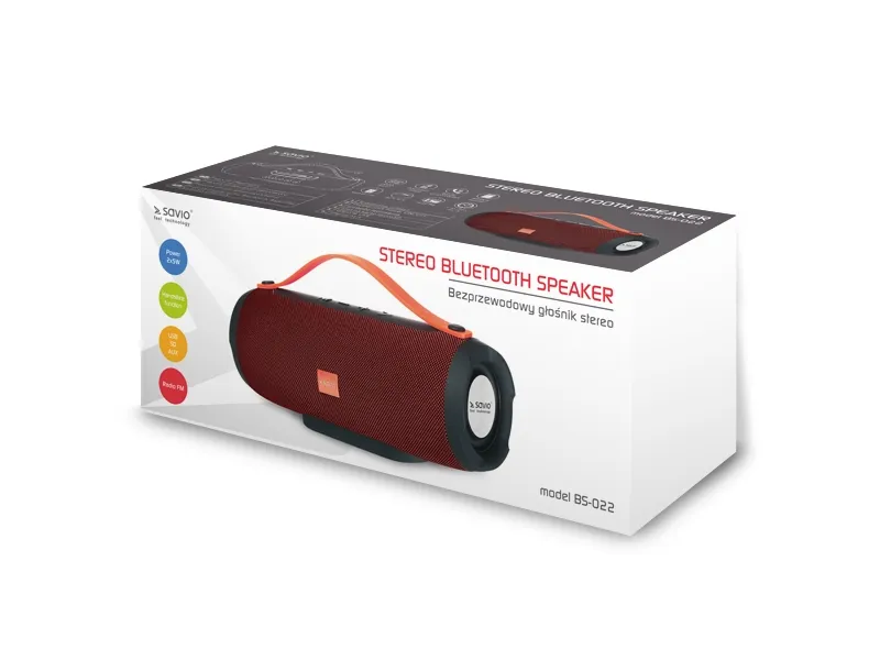 Weight: 700gSavio BS-022. Audio output channels: 1.0 channels, Speaker type: 1-way. RMS rated power: 10 W, Speakers RMS power: 5 W, Frequency range: 120 - 20000 Hz. Connectivity technology: Wired & Wireless, Bluetooth range: 10 m. Product type: Stereo portable speaker, Product colour: Red, Product design: Cylinder. Recommended usage: Universal, Compatible memory cards: SD, Maximum memory card size: 32 GB