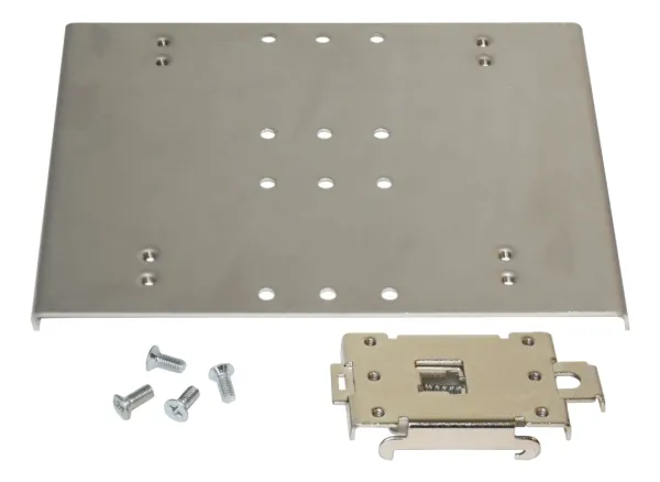 DIN-skinneklips, 4 x M4x8 mm-skruer, rustfri stålplate