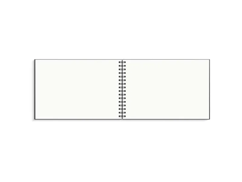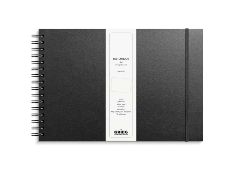 Skitseblok med hårdt kunstskindsomslag, elastik. Syrefrit papir. Cremefarvet, ulinjeret, 150 g, 50 blade. Spiralindbundet. papirformat efter perforering: A4L