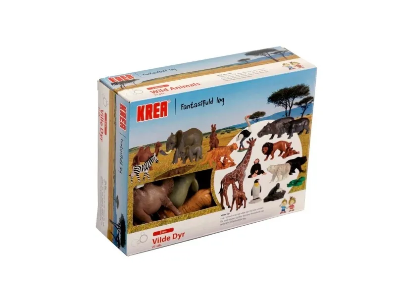 Lær de vilde dyr at kende. I pakken med vilde dyr fra KREA er der hele 21 flotte figurer til mange timers leg, hvor fantasien kan få frit løb. Pakken indeholder: giraf, elefant, flodhest, løver, abe, zebra, kamel, kænguru, struds, bjørn, isbjørn og pingvin. Figurhøjde: 2 - 14 cm. Fra 3 år.