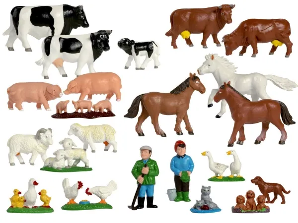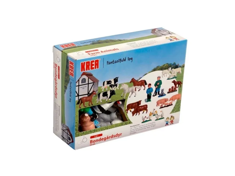 Lær bondegårdens dyr at kende. I pakken med bondegårdsdyr fra KREA er der hele 22 flotte figurer til mange timers leg, hvor fantasien kan få frit løb. Pakken indeholder: Køer, grise, funde, katte, får, høns, heste, gæs, bondemand og bondepige. Figurhøjde: 2 - 7 cm. Fra 3 år.