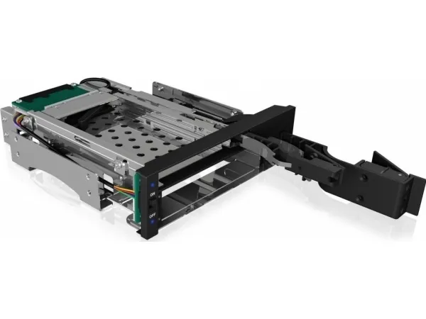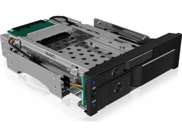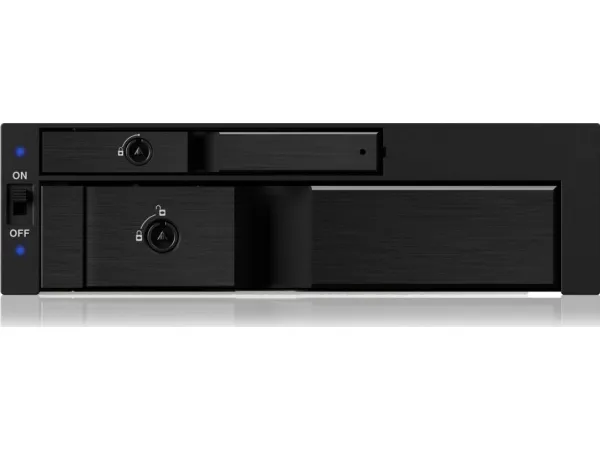 This Mobile Rack is designed for one 2.5" and one 3.5" drive and fits perfectly into a 5.25" bay and thus offers a unique space saving solution. The trayless design and HotSwap cause the exchange of the drives to be faster and more convenient.