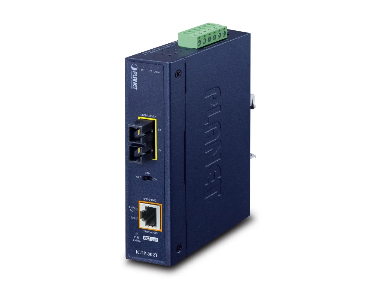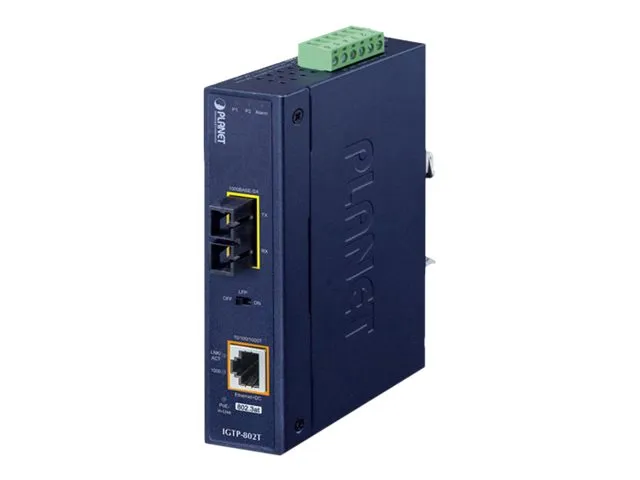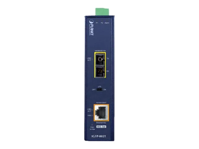 PLANET IGTP-80xT industrial Gigabit media converter combines Ethernet media conversion with 802.3at Power over Ethernet Plus (PoE+) injector to deliver high power output and high data transmission speed to PDs (powered devices) installed in a remote area where sufficient and reliable power input is required. Its 1000BASE-X fiber-optic uplink port provides long distance, high speed and stable data transmission to a remote core network. The special and convenient power system of the IGTP-80xT supports 12-48V DC power input or 24V AC power input for power redundancy and operational flexibility. Being able to operate under the temperature ranging from -40 to 75°C and with an IP30 rugged case, the IGTP-80xT can be placed in almost any difficult environment.