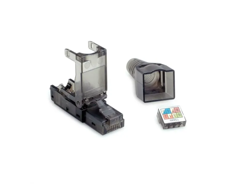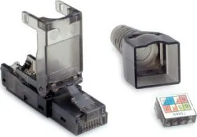 RJ-45-stik, der kan konfektioneres, Kat. (Class EA), UTP Markkonfektionerbart stik til massiv tråd- og litskabel 8-ledet feltsamling af uskærmet RJ45-stik til AWG26/1-AWG23/1, AWG26/7-AWG24/7 uden specialværktøj kan konfektioneres til kabel med kabeldiameter 6,0 til 9,0 mm trækaflastning med kabelbinder transparent sort