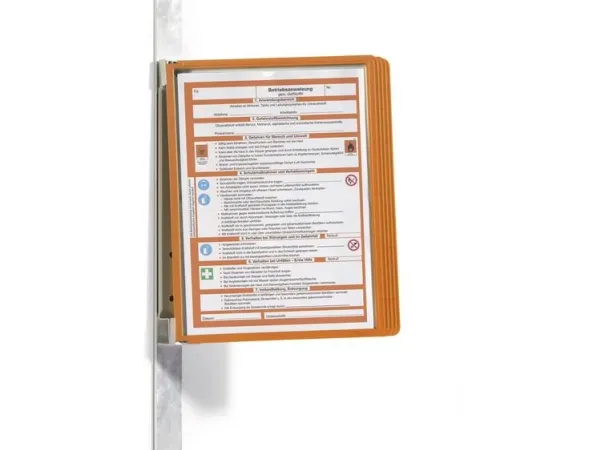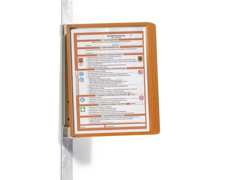 Tavlesystem Vario® MAGNET WALL 5, orange Vægholder med 5 SHERPA® gennemsigtige tavler i A4-format · med magnetisk bagside, kan hurtigt og nemt fastgøres på metalliske underlag som reoler eller maskiner · ideal til mærkning af farlige stoffer. VARIO® tavlesystem egner sig takket være robuste holdere til vedvarende anvendelse i lager- og produktionsmiljøer. · Vægholder med 5 SHERPA®-gennemsigtige tavler i A4-format · Gennemsigtige tavler af polypropylen med farvet profilramme og folie med færre refleksioner, egnet til scanning · Metal-vægholder med magnetisk bagside, kan hurtigt og nemt fastgøres på metalliske underlag som reoler eller maskiner · Praktisk tapmekanik gør det let at udskifte tavler · Mål 360 x 325 x 260 mm