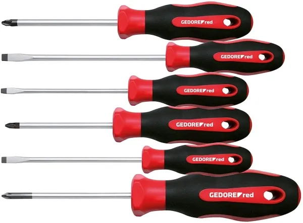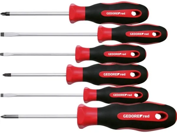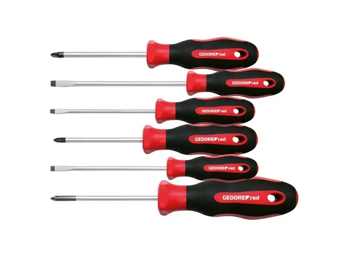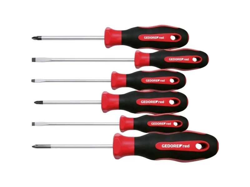 Skruetrækker-sæt • udførelse iht. din 5264 og din 8764 • klinger af krom-molybdæn-stål af høj kvalitet, forkromet • fosfateret drivspidser, korrosionsbeskyttet og slidstærk • støbte greb danner en fast enhed med klingerne • 2-komponentgreb, håndskånende kraftoverførsel • 5-kant-grebshoveder forhindrer, at værktøjet ruller væk i håndtaget til ophængning