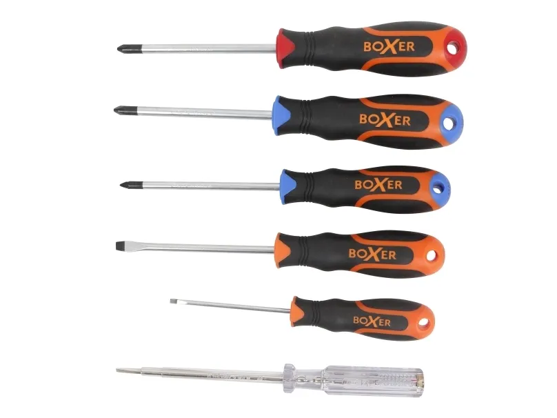 1 x PH2 x 100 mm anvendes til Phillips-skruer 1 x PZ1 x 100 mm anvendes til Pozidrive-skruer 1 x PZ2 x 100 mm anvendes til Pozidrive-skruer 1 x LK3 x 75 mm anvendes til for lige kærv-skruer 1 x LK5,5 x 100 mm anvendes til for lige kærv-skruer 1 x Polsøger 190 mm anvendes f.eks. til at konstatere vekselspændinger