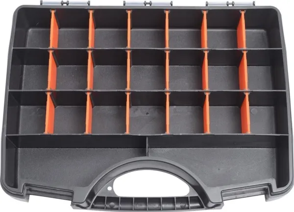 Antal rum: 21 Længde: 31 cm Bredde: 24 cm Højde: 5 cm Justerbar skillerum til personlig indretning Materiale: PP Farve: sort / orange / transparent