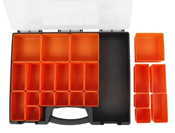 Antal rum: 22 Længde: 41 cm Bredde: 33 cm Højde: 6 cm Flytbare kasser til personlig indretning. Materiale: PP Farve: sort / orange / transparent