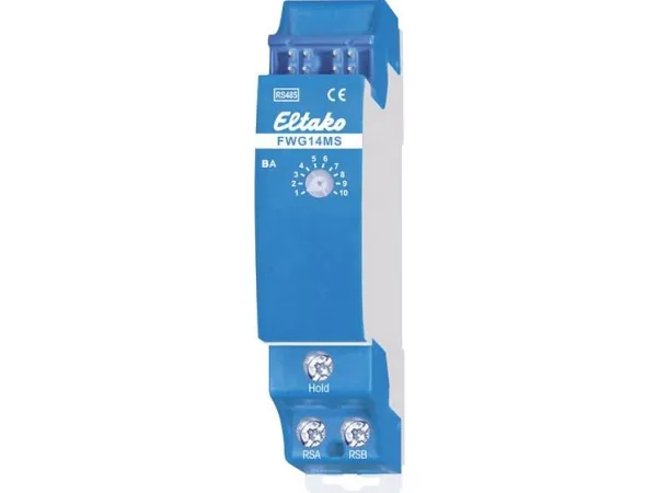 RS485-bus-vejrdata-gateway Vejrdata-gateway til multi-sensor MS. Tovejs. Standby-tab kun 0,3 watt. Rækkeindbygningsapparat til montering på bæreskinne din en 60715 TH35. 1 delingsenhed = 18 mm bred, 58 mm dyb. Til gatewayen tilsluttes en multi-sensor MS til klemmerne RSA og RSB. Oplysningerne modtages en gang i sekundet og konverteres til bus-telegrammer. Kun 1 multi-sensor MS kan tilsluttes til et FWG14MS. Der kan dog tilsluttes flere FWG14MS til en multi-sensor MS, for eksempel til styring af flere Eltako-RS485-busser med kun en multi-sensor MS. Kun hvis der er tale om et FWG14MS, skal den udvendige modstand være til stede. Ved andre FWG14MS skal den derimod fjernes. Tilslutning til Eltako-RS485-bussen. Tværledningsføring bus og strømforsyning med stikbro. Drift i forbindelse med FAM14 eller FTS14KS. Hold-klemmen forbindes med FAM14 eller FTS14KS. Der kan anvendes op til 2 FWG14MS i en bus. FTD14-telegrammer kan også sende telegrammer til radio i bygninger, hvis FGW14MS' id'er indlæses i FTD14 eller registreres med PTC14. Modtagere kan så være FSB14, FSB61NP, FSB71 og FWA65. Hvis multisensorens signal forbliver fra MS, sendes der et alarm-telegram. Med PC-Tool PCT14 kan der tilsluttes 96 indgange og hhv. eller tilknyttes og udlæses på op til 12 udgange. Indstillingen af driftstyper-drejeknappen BA foretages i henhold til betjeningsvejledningen. Med PC-Tool PCT14 kan der foretages yderligere indstillinger.