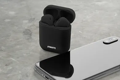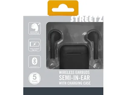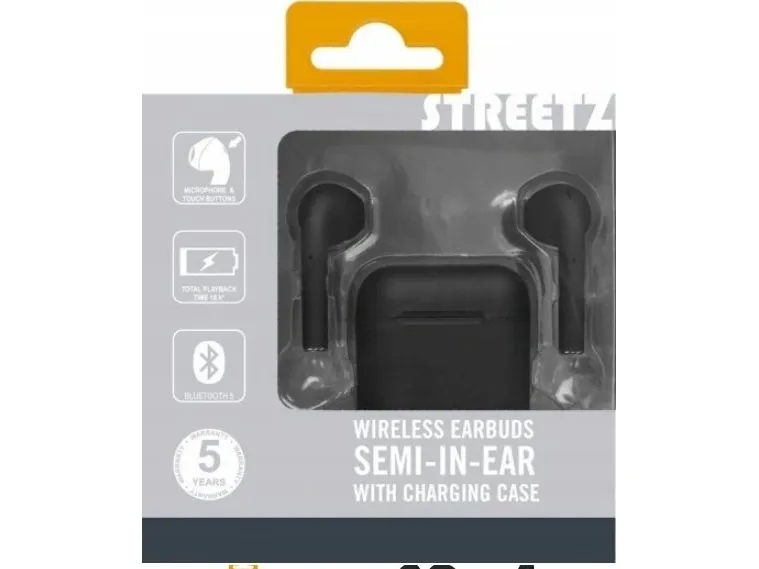 Streetz wireless TWS headphones with built-in microphone and call and media buttons are made with an ergonomic fit for comfortable listening. The latest Bluetooth 5 standard offers a longer range (up to 10 m) as well as other benefits such as reduced power consumption and a more stable connection. With Streetz wireless headphones, you don't have to worry about the batteries running out. With up to 18 hours of play time with the included charging case, you can talk, listen to music or podcasts all day long