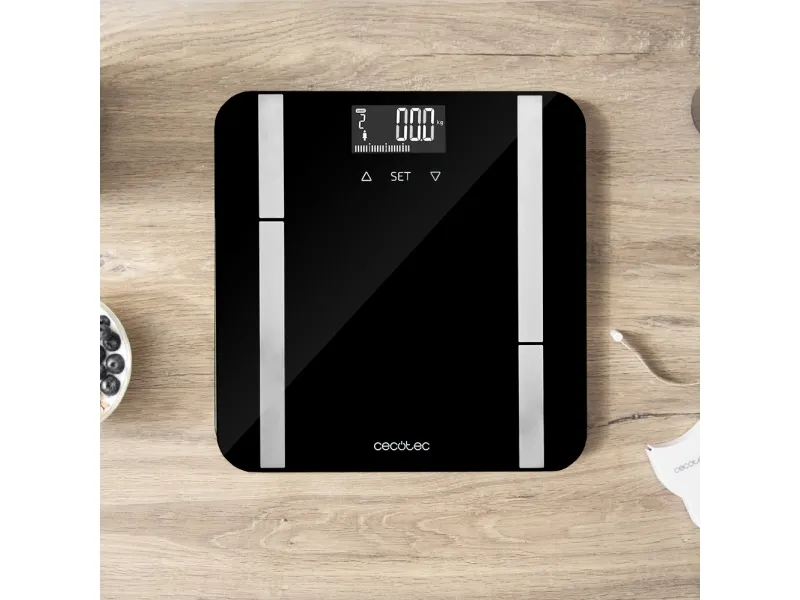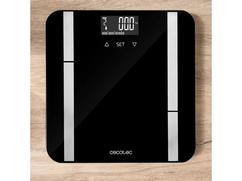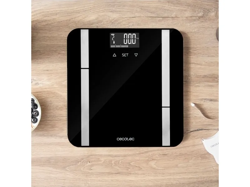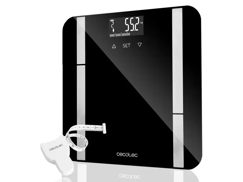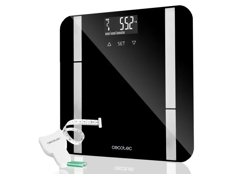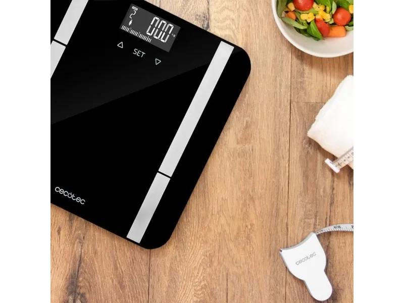 Surface Precision 9450 Full Healthy Electric and digital bioimpedance bathroom scale. Smart and precise. High-security platform made of tempered glass, backlit LCD display and maximum load capacity of 180 kg. Ready to use. Includes measuring tape. Surface Precision 9450 Full Healthy de Cecotec. Large-surface digital bathroom scale, 300 x 300 mm. Large measuring range, from 5 kg (11 lb) up to 180 kg (400 lb) measured by 100 g (0.2 lb), increasing its liability. FourPrecision: high measuring precision thanks to its 4 sensors. TenBIA: bioelectrical impendance measurement method (BIA) with full body analysis and 10-parameter precise measuring: weight, body fat, body mass index, muscule mass, bone mass, body age, water, visceral fat, basal metabolism and evaluation of physical conditions. Backlit display for easier visibility of the results. Multifunction EasyUsability: auto-off and auto-on when you step on the scale. Low-battery indicator that idicates when the batteries need to be changed.overload indicator when weight is over the maximum accepted. UserClever: automatic identification of up to 10 user through previous recorded results. SafeGrip: 4 silicone feet that improvefloor grip and add security. Easy-to-read results with its LCD display, 74 x 38 mm, measured in kilos and pounds. Black extra-flat platform made of high-security tempered glass, with high-quality electrodes made of stainless steel. Includes measuring tape to help volume-measuring control and batteries.Cecotec Surface Precision 9450. Type: Electronic personal scale, Maximum weight capacity: 180 kg, Accuracy: 100 g. Display: LCD, Display size (HxV): 74 x 38 mm. Power source type: Battery, Battery type: AAA. Width: 300 mm, Depth: 300 mm, Weight: 1.8 kg. Quantity per pack: 1 pc(s)