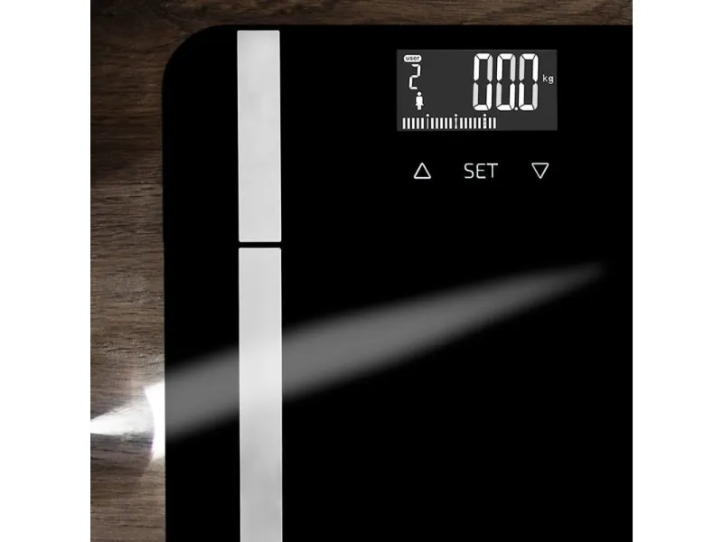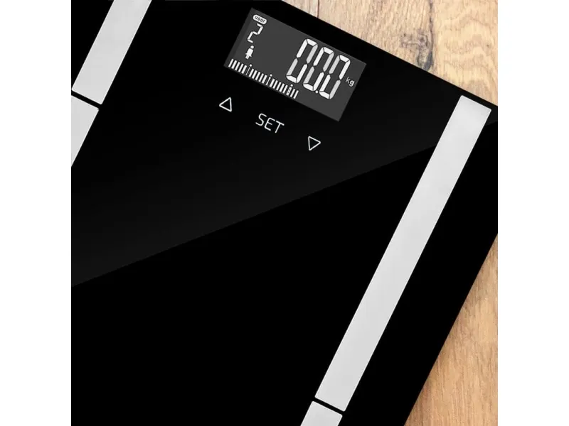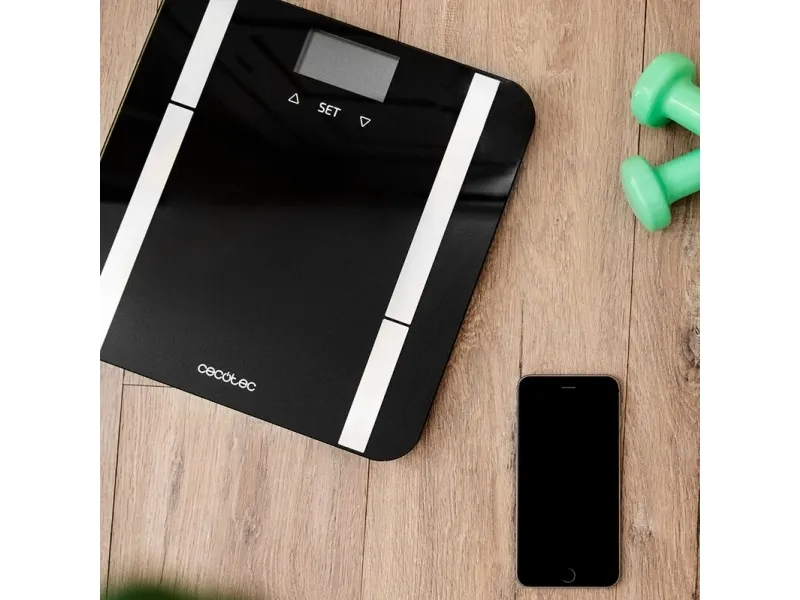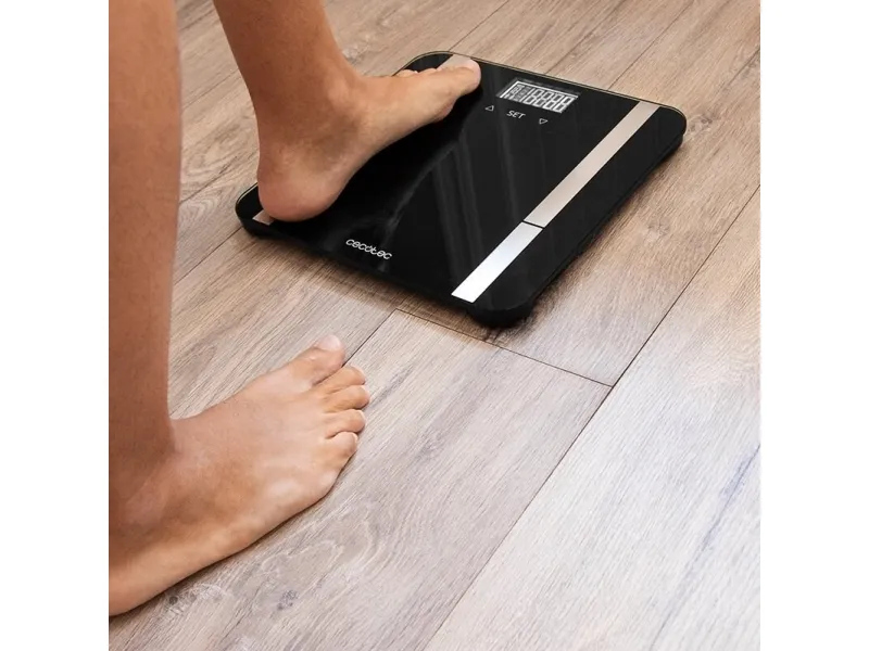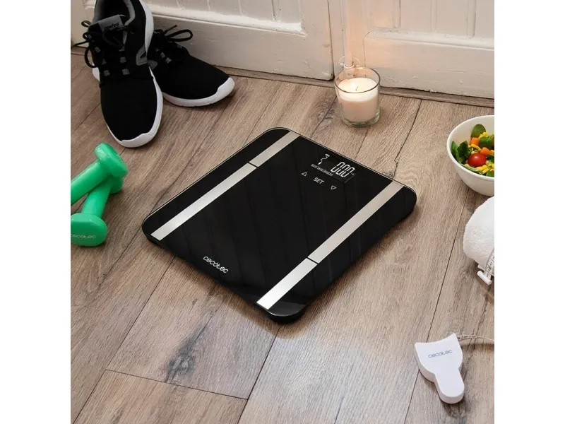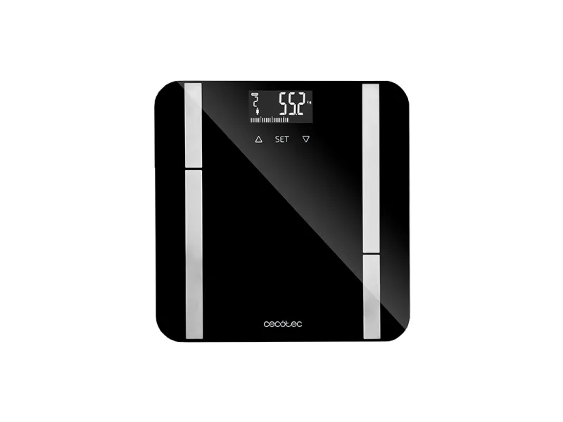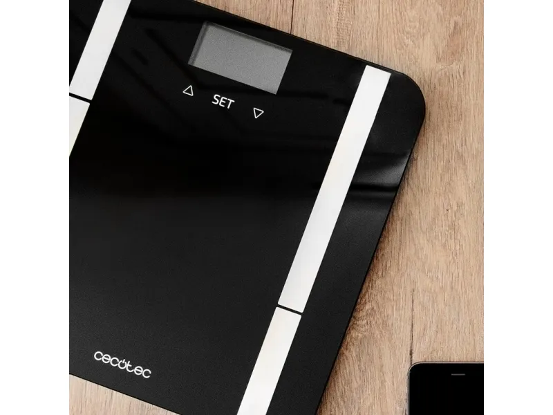 Surface Precision 9450 Full Healthy Electric and digital bioimpedance bathroom scale. Smart and precise. High-security platform made of tempered glass, backlit LCD display and maximum load capacity of 180 kg. Ready to use. Includes measuring tape. Surface Precision 9450 Full Healthy de Cecotec. Large-surface digital bathroom scale, 300 x 300 mm. Large measuring range, from 5 kg (11 lb) up to 180 kg (400 lb) measured by 100 g (0.2 lb), increasing its liability. FourPrecision: high measuring precision thanks to its 4 sensors. TenBIA: bioelectrical impendance measurement method (BIA) with full body analysis and 10-parameter precise measuring: weight, body fat, body mass index, muscule mass, bone mass, body age, water, visceral fat, basal metabolism and evaluation of physical conditions. Backlit display for easier visibility of the results. Multifunction EasyUsability: auto-off and auto-on when you step on the scale. Low-battery indicator that idicates when the batteries need to be changed.overload indicator when weight is over the maximum accepted. UserClever: automatic identification of up to 10 user through previous recorded results. SafeGrip: 4 silicone feet that improvefloor grip and add security. Easy-to-read results with its LCD display, 74 x 38 mm, measured in kilos and pounds. Black extra-flat platform made of high-security tempered glass, with high-quality electrodes made of stainless steel. Includes measuring tape to help volume-measuring control and batteries.Cecotec Surface Precision 9450. Type: Electronic personal scale, Maximum weight capacity: 180 kg, Accuracy: 100 g. Display: LCD, Display size (HxV): 74 x 38 mm. Power source type: Battery, Battery type: AAA. Width: 300 mm, Depth: 300 mm, Weight: 1.8 kg. Quantity per pack: 1 pc(s)