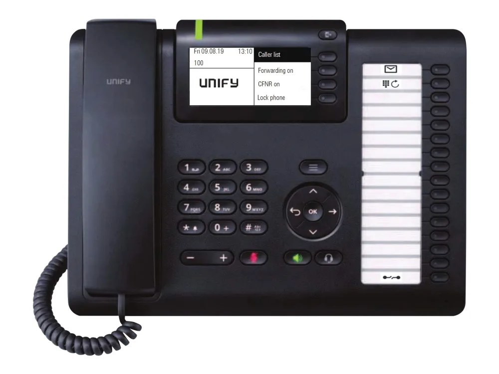 The OpenScape Desk Phone CP400T is considered as the phone for the standard office workplace. The device itself already provides 16 freely programmable function keys with colored LED (green) status indication, three of these keys are pre-assigned with the functions message, redial and disconnect. The paper label reduces the costs and takes into account the customer's request for many keys. The OpenScape Desk Phone CP400T uses the standard Key Modules KM400, which were already introduced with the OpenScape Desk Phone IP portfolio. It can be extended with up to two Key Modules KM400. This gives users direct and quick access to their functions-, name- or linekeys.