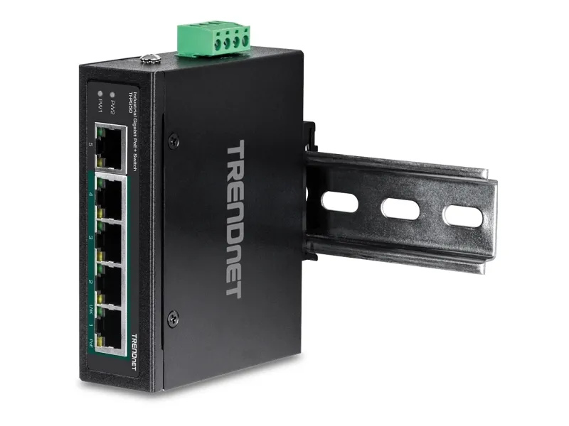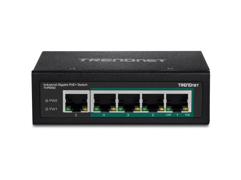 TRENDnet’s 5-Port Industrial Gigabit PoE+ DIN-Rail Switch, model TI-PG50, has four gigabit PoE+ ports with a 120W PoE power budget. Users are able to connect four PoE+ devices to this industrial switch, while simultaneously providing a non-PoE gigabit port for connectivity to the network. The TI-PG50 industrial switch is equipped with an IP30 rated metal enclosure, designed to withstand a high degree of vibration and shock, while operating within a wide temperature range of -40° – 75° C (-40° – 167° F) for industrial environments.