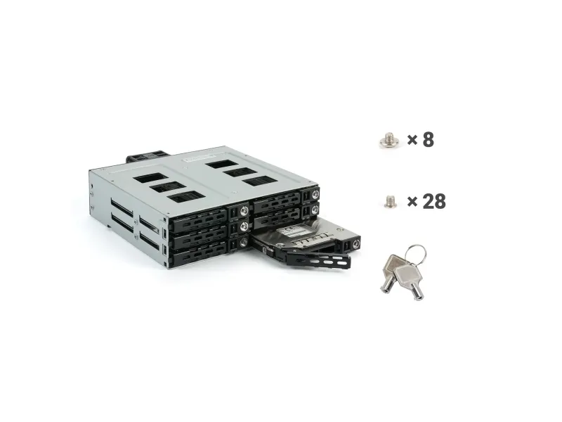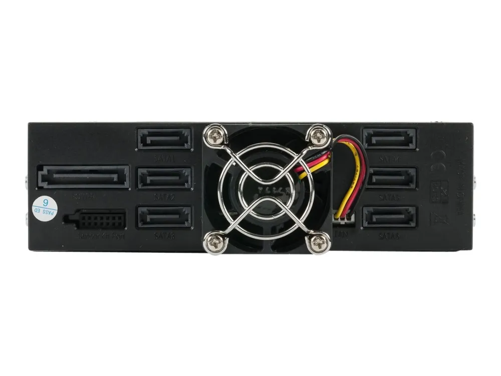 SAS I, II + SATA I,II, III backplane for 3x 3,5"/2,5" HDD/SSD in a 2x 5,25" tray. With 70mm fan on the back. Hard drive trays. Aluminum case and front in black.