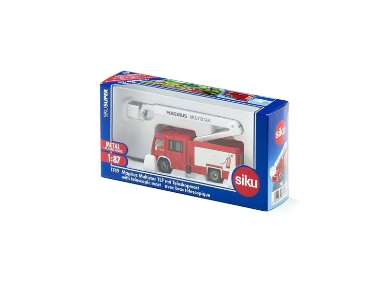Combination of fire truck and rescue ladderThe Magirus MultiStar is a unique combination worldwide - water tender and telescopic boom with rescue basket. Using this vehicle during an emergency, the fire brigade can extinguish the fire and can use the telescopic boom to fight a fire at height or to save lives. On the siku vehicle, the boom can be folded a number of times, and can rotated through 360 degrees. The extendible supports stabilise the vehicle for rescue at height.