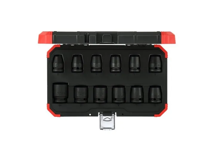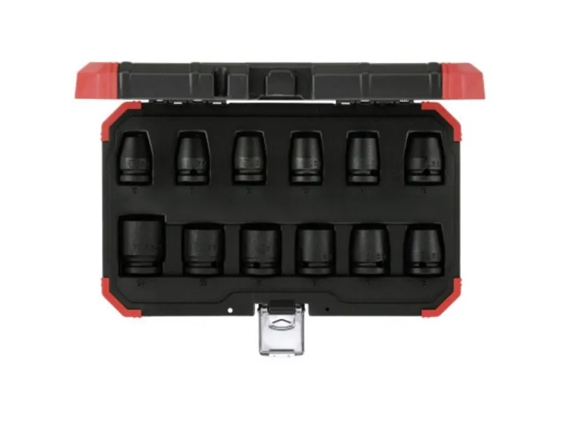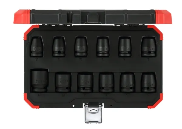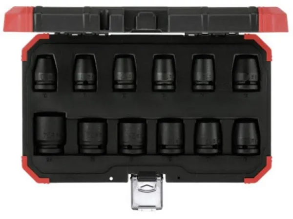 Kraft skruemaskine topnøglesæt 1/2 12 dele Til maskiner betjente løsn og tilspænding af skruer og møtrikker Perfekt supplement til eksisterende 1/2 machinenbetriebenen drev værktøj Egnet til slagnøgle (maskiner aktiveret) Boring til fastgørelse med låsering og sikring stift Overfladebeskyttelse med og miljøvenlig fosfatering Krom-molybdæn-stål Udførelse iht. DIN 3129, ISO 2725-2 Indvendig firkantaksel iht. DIN 3121 - G 12,5, ISO 1174 Robust plastkuffert med metalhængsler og metal lukning Orden og fiksering af toppe med klemmesikring