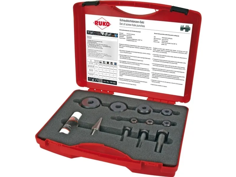 Stanseværktøjer 12-delt skruehulstansesæt , 7 skruehuller diameter 16,5 (M 16) - 20,4 (M 20 / PG 13,5) - 25,4 (M 25) - 32,5 (M 32) - 40,5 (M 40) - 50,5 (M 50) + 63,5 mm (M 63) + 1 pladebælbor HSS str. 2 + 1 skærepasta 30 g + 1 trækskrue MF 10 x 1,0 x 45 + 1 trækskrue MF 12 x 1,5 x 55 + 1 trækskrue MF 16 x 1,5 x 60 styrkeklasse 12.9 med få greb tyndvæggede materialer hurtigt, uden besvær, bland præcist og gratfrit. Særligt velegnet til anvendelse med skruenøgler, håndhydraulik eller fodhydraulik.