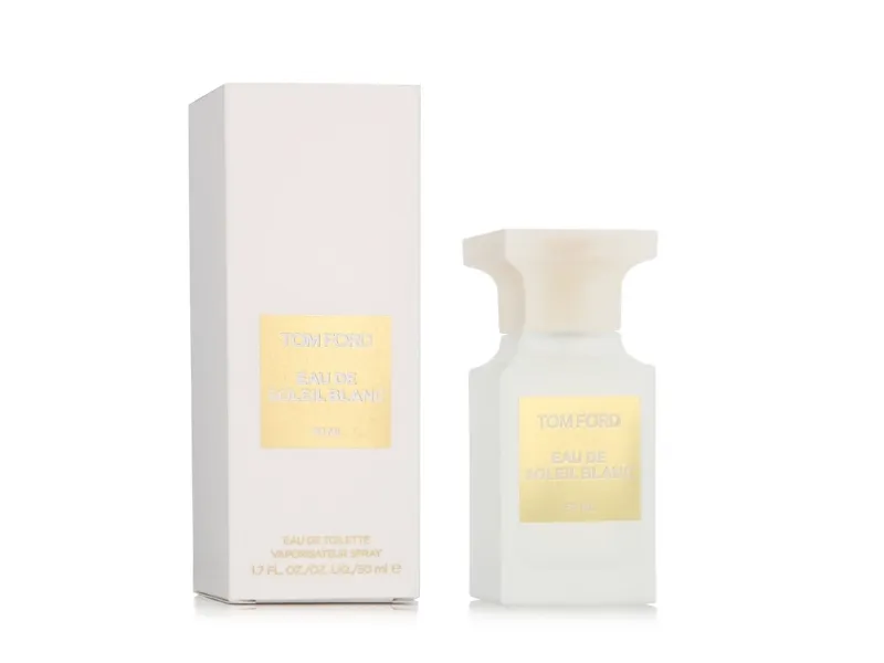 ABOUT THE BOTTLE: Eau de Soleil Blanc is contained in a frosted white Private Blend bottle. The 50mL and 100mL flacon has the sleek, architectural look of a chess piece with a glossy gold-tone label and a gold-tone Tom Ford logo on the cap. The bottle is packaged in a white cross-hatched carton.