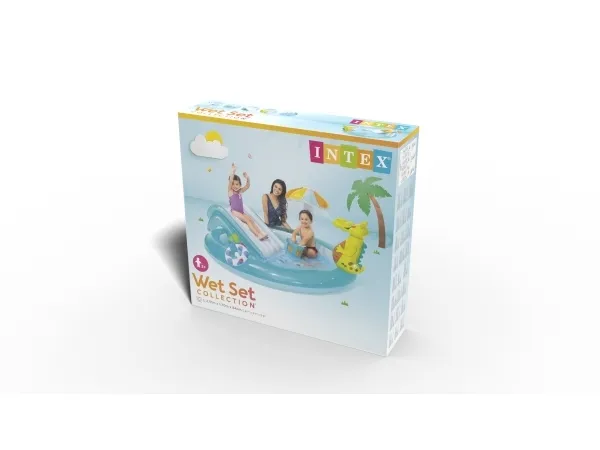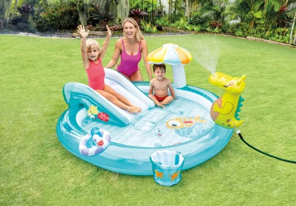 Flott aktivitetsbasseng med sklie, fiskebøtte, vannspray m.m. Barna vil elske dette badelandet! Det er både vannsklie, en sjampinjong som gir skygge, en alligator som spruter med vann, en babyand og en fiskebøtte. Med andre ord er det mulighet for uendelig timers moro! Under vannsklia er det en landingsmatte, så man lander mykt. Man kan koble til vannslangen for å legge til et ekstra lag av moro, for alligatoren spruter vann. På den måten blir barna også nedkjølte i sommervarmen. Bassenget måler 201 x 107 x 84 cm og rommer maks. 160 L. Egnet til barn fra 2 år – men under tilsyn av voksen.