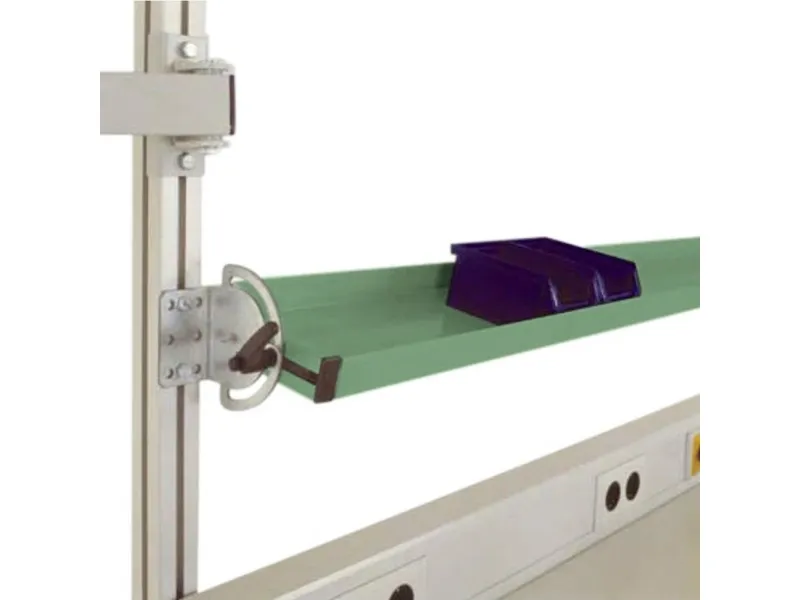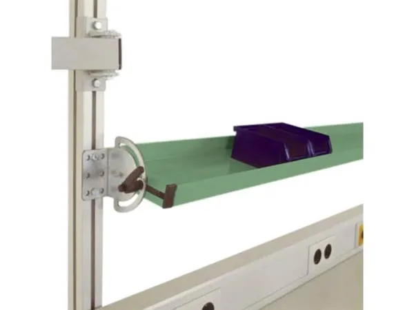 Tiltbar ESD-aflægningskonsol til UNIVERSAL- og CANTOLAB, nyttedybde 195 mm. Til bordbredde 1750 mm Den fremadskridende udvikling inden for elektronik tenderer til stadig mindre komponenter. Med den stadigt mindre størrelse af diverse komponenter bliver også de mikroskopisk små afstande mellem isolatorer og kredsløb inden for komponenterne stadig mindre, så der er behov for passende beskyttelsesforanstaltninger. Meget lille statisk afladning kan ikke mærkes for den enkelte person, men alligevel skadelig for elektroniske komponenter og komponenter. Dette forværres af, at skader forårsaget af den elektrostatiske ladning ikke kan identificeres med det blotte øje. Elektrostatisk beskyttede områder og ESD-enkeltarbejdspladser er næsten nødvendige inden for al elektronik- og halvlederproduktion. Med vores ESD-arbejdspladssystemer hjælper vi dig med at undgå elektrostatisk afladning og beskytte dine komponenter. Den vippelige ESD-opbevaringsrum til alle UNIVERSAL- og CANTOLAB-arbejdsborde med en bordbredde på 1750 mm, fungerer til optimering af arbejdskapaciteten ved hjælp af værktøjsstillingen i gribeområdet og aflaster dermed personalet fysisk. Takket være den stabile stålpladekonstruktion og den påkantning på 38 mm kan diverse smådele, værktøj og maskiner stilles til rådighed. Den samlede bredde på ESD-konsollen er 1750 mm, den samlede dybde 200 mm og totalhøjde 38 mm. Den har en anvendelsesdybde på 195 mm. Den hældbare aflægningskonsol er med førsteklasses pulverbelægning i Resedagrøn RAL 6011 ledende. ESD-hyldekonsollen, som kan vippes, fastgøres til aluminiummonteringsportaler. Belastningsevne på op til 35 kg. Den fralægningskonsol kan vippes trinløst og kan dermed udstyres med for eksempel opbevaringskasser. Trinløst kan den også indstilles i dybden, hvorved også udragende produkter kan placeres godt, eller der kan skabes yderligere arbejdsområder.