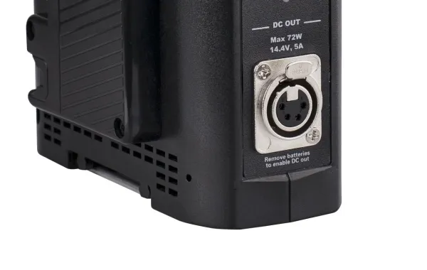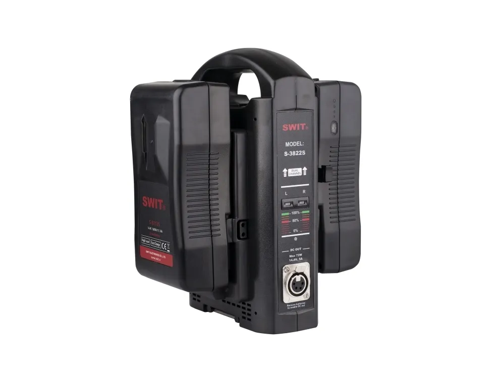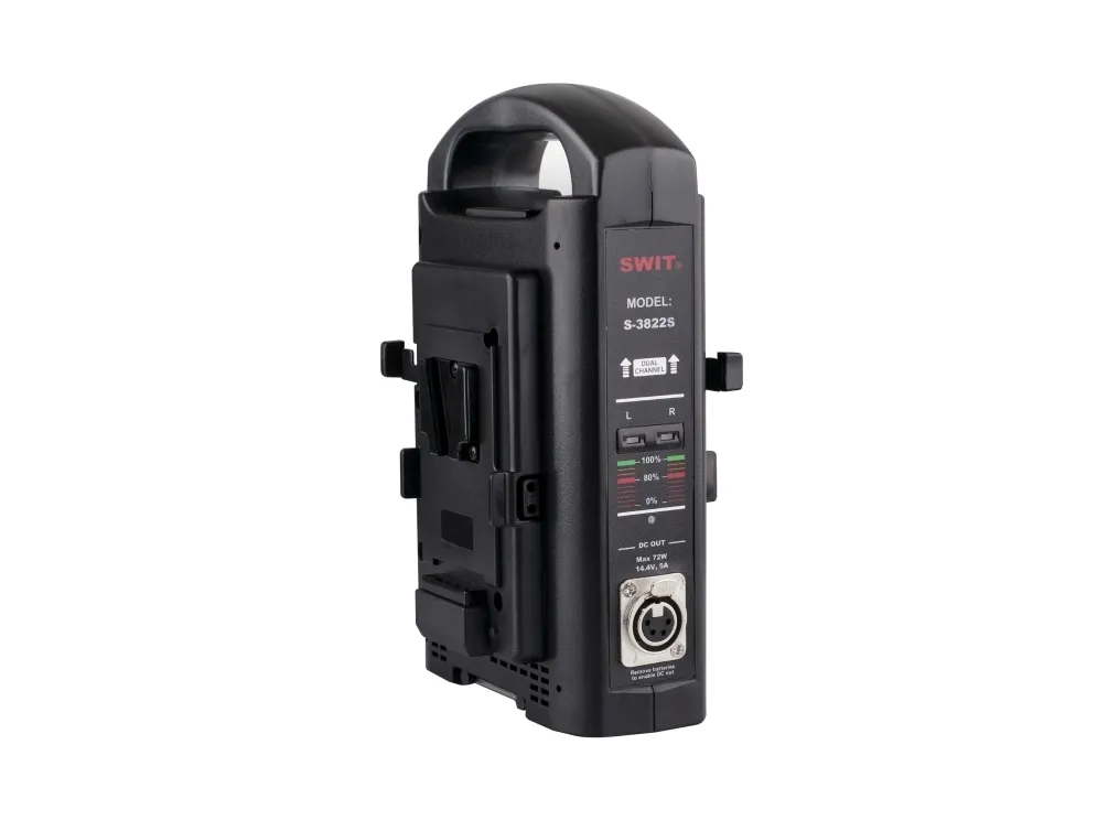The portable charger S-3822S can charge 2 V-mount batteries simultaneously. S-3822S has LED charging indicators on the front panel, indicates the real time capacity of each channel by different colors. S-3822S has a 4-pin XLR female connector on the front panel. Connected with SWIT S-7102 XLR female to male cable, the S-3822S can be used as AC-DC adaptor of DC 14.4V, 5A, 72W output.