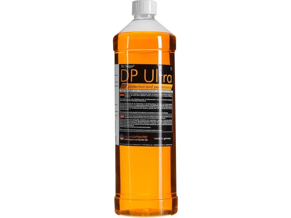 DP Ultra is produced from high-quality absultely pure components in germany. It has been specifically designed for the requirements of PC watercooling systems which use often mixed materials like copper and alumnium.The electric conductivity has been reduced to an minimum. The active ingredients also reduce the appearance of bubbles in the cooling fluid and optimizes the heat transfer between the surfaces and the fluid making it ideal for use in watercooling systems. DP Ultra is a clear and virtually odor free water based solution.