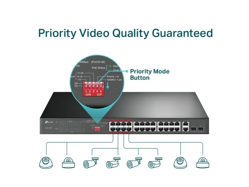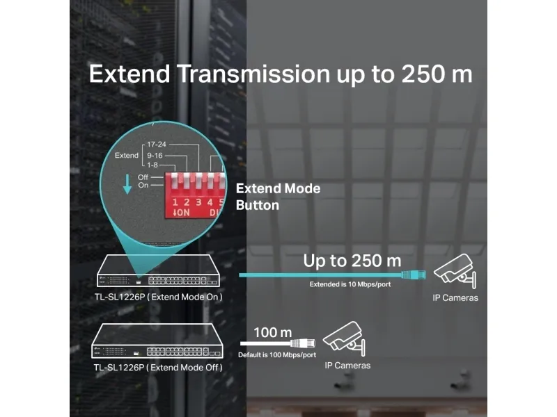 TP-Link's new PoE/PoE+ switches with all 10/100 Mbps RJ45 ports supporting the PoE+ standard provides a simple way to expand the wired network while transferring power over the same Ethernet cable at the same time. With up to 30 W per port TL-SL1226P can power more high-powered devices such as Access Points, IP Cameras, IP Phones and so on. Moreover, with innovative Extend Mode, devices can get PoE power supply and data transmission from a distance of 250 m. Priority mode ensures high priority for port 1 - 8, which guarantees the quality of sensitive applications. TL-SL1226P supports Isolation Mode that divides traffic for ports 1 - 24 for higher security and performance.