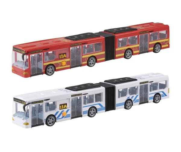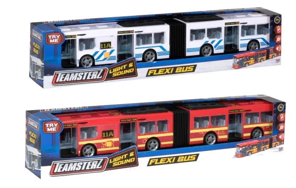 Teamsterz Flexi bus med lys og lyd Flot, lang rednings-flexibus fra Teamsterz. Bussen er med døre, der kan åbnes og flexibelt led mellem bussens 2 dele. Tryk på knappen på siden for at få lys på bussen og seje lyde. Bruger 2 x LR44-batterier (prøvebatterier med begrænset levetid medfølger)