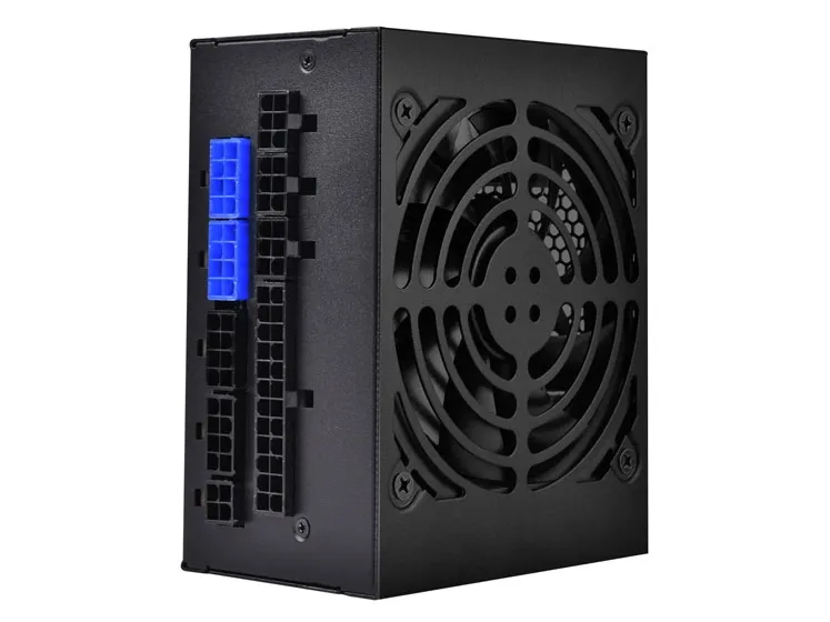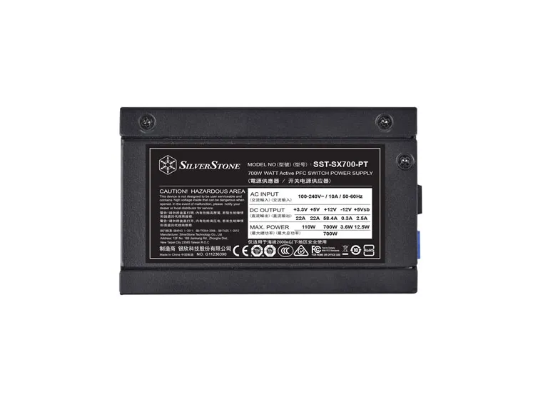 The SilverStone SST-SX700-PT power supply offers robust performance with a power output of 700 watts, ensuring reliability for demanding systems. With a fully modular design, it allows for flexible cable management, helping to maintain clean and efficient builds. The power supply is equipped with multiple safety features including overcurrent, overvoltage, overpower, undervoltage, and short-circuit protection, all contributing to a safe operating environment. Additionally, it operates efficiently with an 80 PLUS Platinum certification, achieving 90% efficiency at full load and 87% at lower loads. Designed for various operating conditions, the SST-SX700-PT supports a wide input voltage range and provides an effective cooling solution with a 92 mm fan that operates quietly at just 18 dB. With MTBF rated at 100,000 hours, this power supply ensures long-lasting performance. Ideal for both standard and server applications, it is compliant with ATX12V 2.4 and SFX12V specifications, making it a versatile choice for various builds.