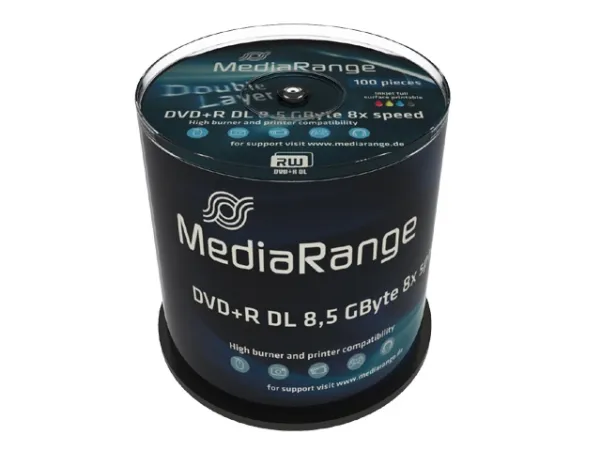 The Double Layer technology provides nearly the double capacity as a conventional DVD. Through the increase of the data-volume, MediaRange DVD+R DL discs can also be used for high-resolution films in cinema quality with a playing time from over two hours or up to four hours using high-resolution MGEG-2 format. In addition the MediaRange DVD+R DL discs are compatible with DVD-ROM drives and DVD players.
