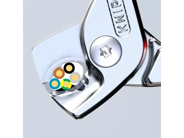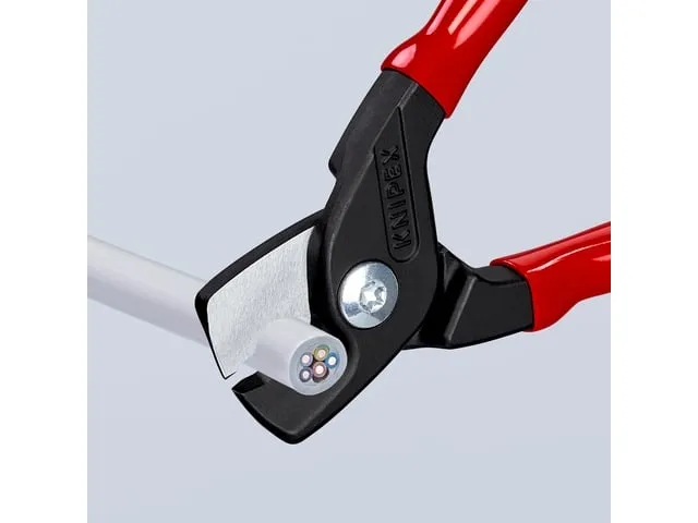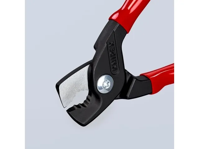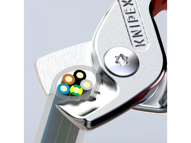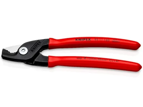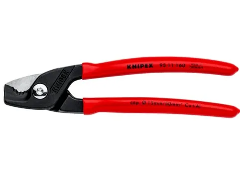 95 11 160 KNIPEX StepCut® Lille, let, stærk: Komfortabel afskæring uden knusning og blot 160 mm lang. Markant lettere arbejde: Gradueringerne skærer ledningerne nemt over, og det er op til 40 % lettere at skære end med almindelige kabelsakse i samme længde!. Ergonomisk håndtag: Optimal skærefølelse selv ved store kabeldiametre. Skærer bløde multicore-kabler i kobber og aluminium op til Ø 15 mm (50 mm²). Skærer massive kobber- og aluminiumkabler på op til 5 x 4 mm². Skærer uden at knuse. Boltforbindelse: Præcis, ubesværet og holdbar. Klemmebeskyttelse for sikkert arbejde. Ikke egnet til stålwirer og hårdttrukne kobberledere. Skær yderligere induktivt hærdede, skærhårdhed ca. 56 HRC.