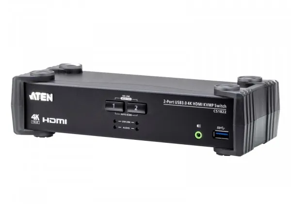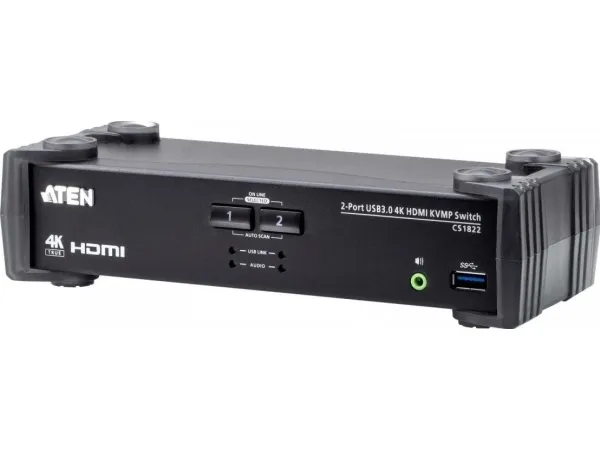 The ATEN CS1822 KVMP Switch offers effortless management of two HDMI interface computers from a single USB keyboard, mouse and HDMI monitor. The CS1822 optimizes user experience of multitasking. What's more, the default EDID mode is available for smooth power-up, high-quality display and eliminates monitor compatibility issue. In addition, the CS1822 features audio mixer mode which mixes audio sources from any two connected computers as audio output, benefiting users to be notified without missing any system alert even the KVM focus is set on other computers.