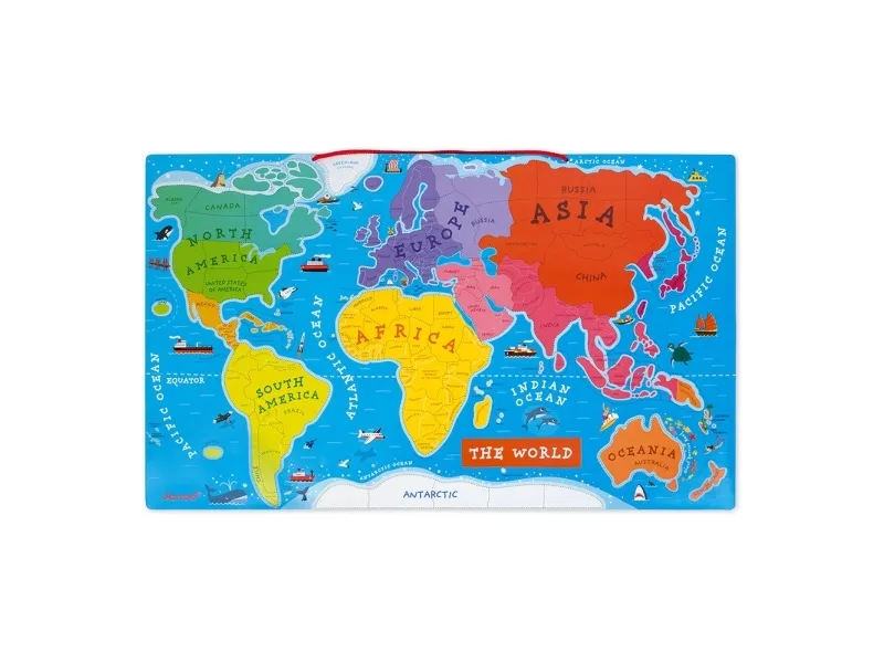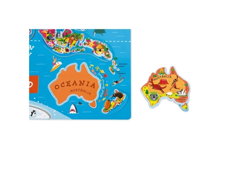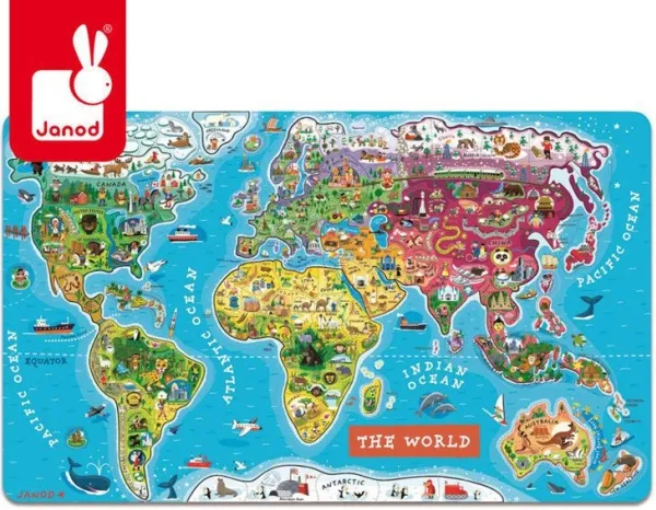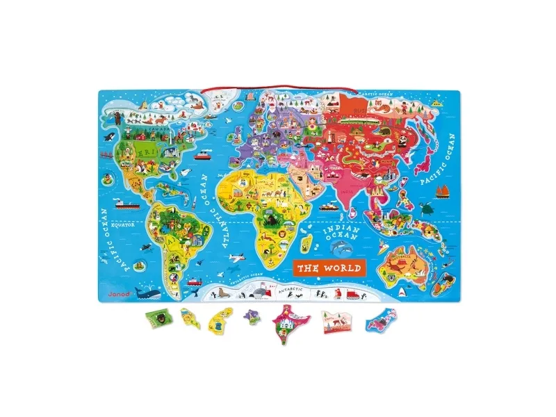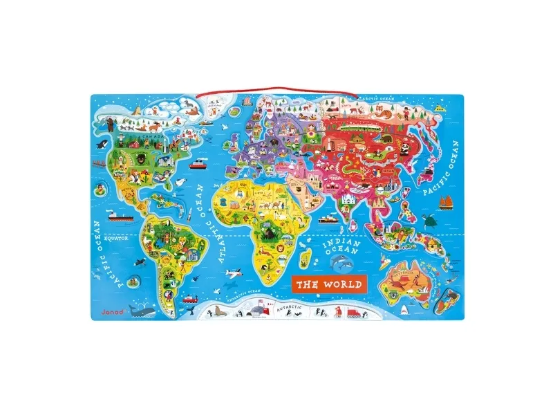 Around the world in 92 magnets! A fun and educational way of discovering the planet. Each magnet represents a country or region of the world, with its name, capital and an illustration characteristic of that part of the world. The big magnetic board shows the world with its continents and oceans : the colour used for each region helps you find its place. Have fun putting each country in its place and you will have a wonderful map of the world which you can hang on the wall.