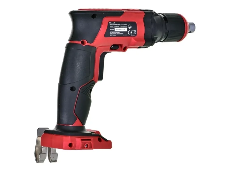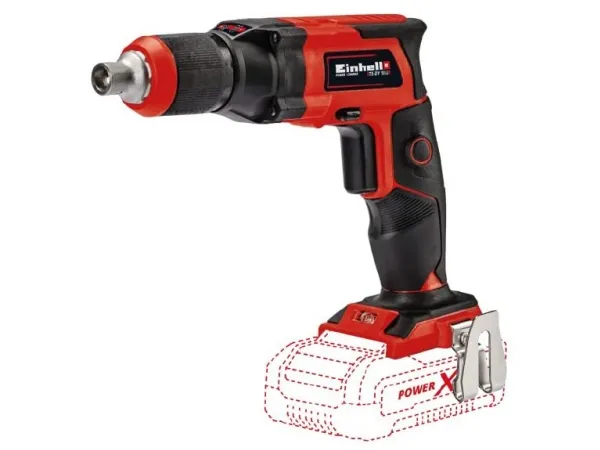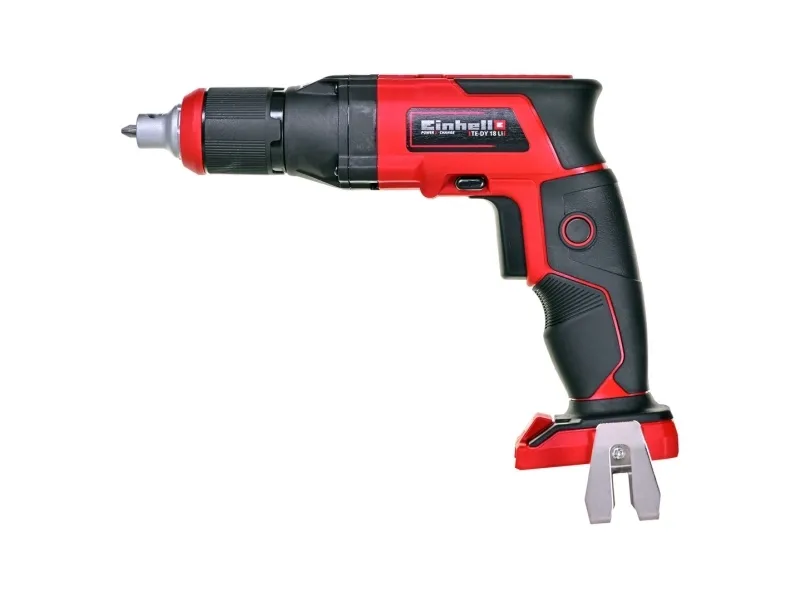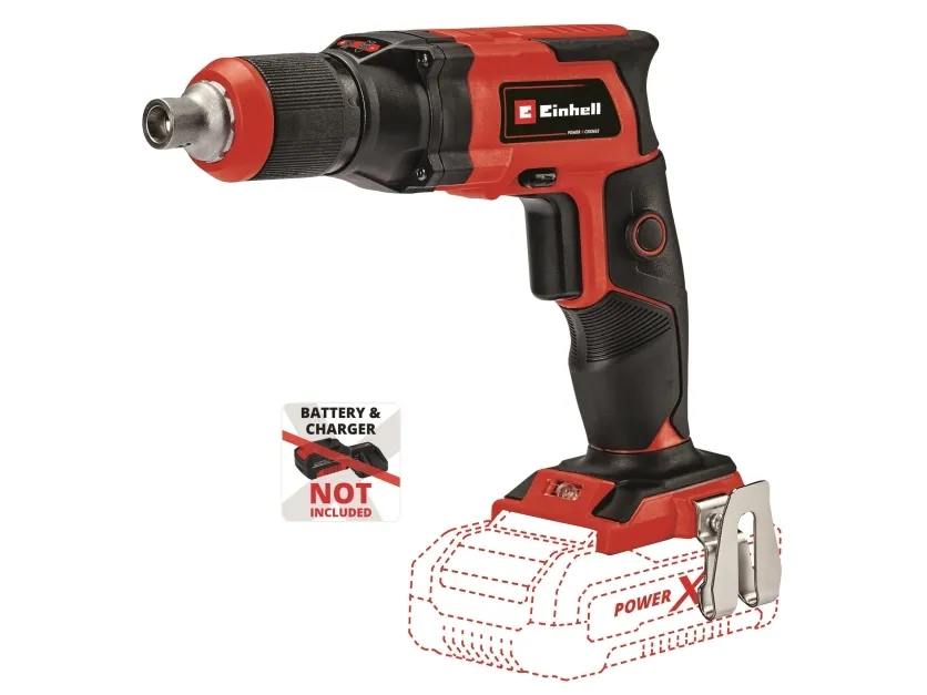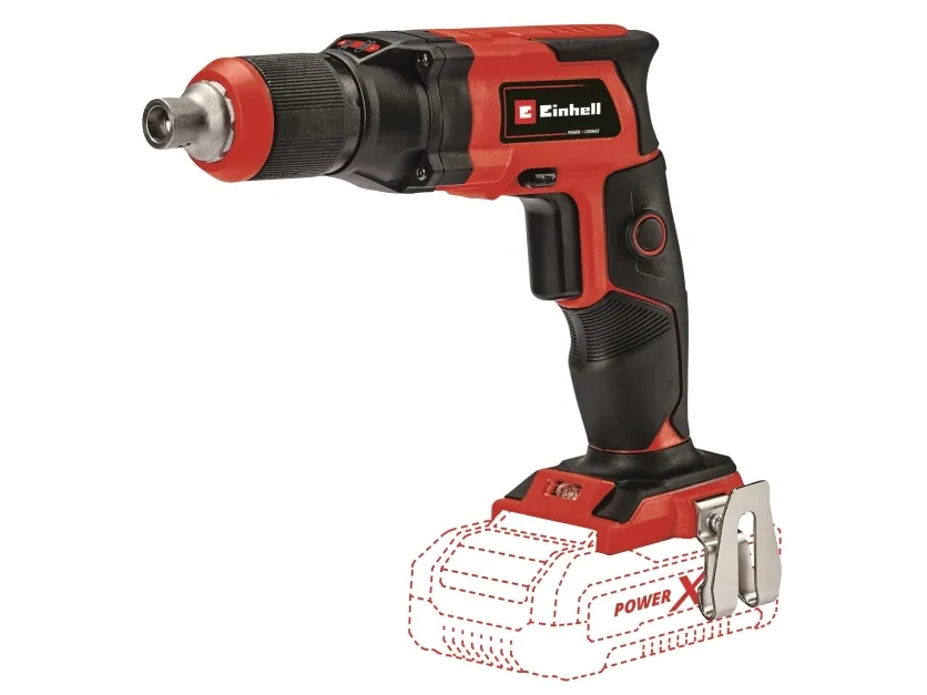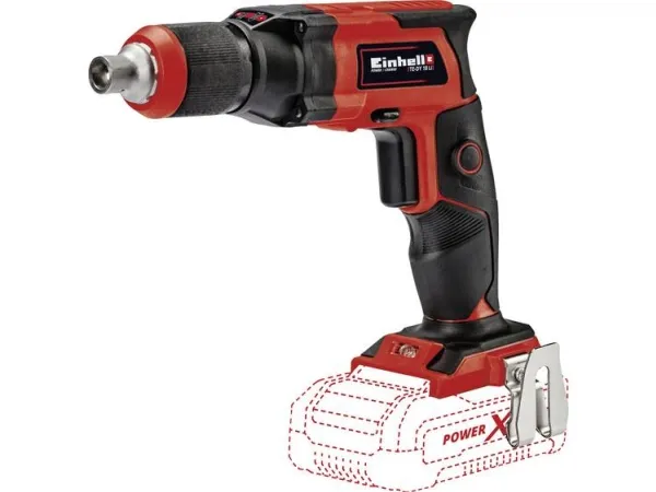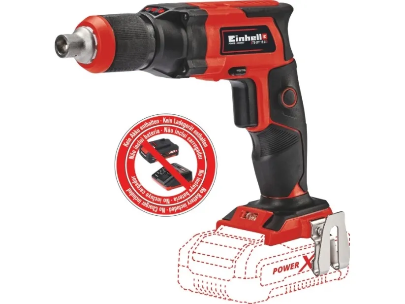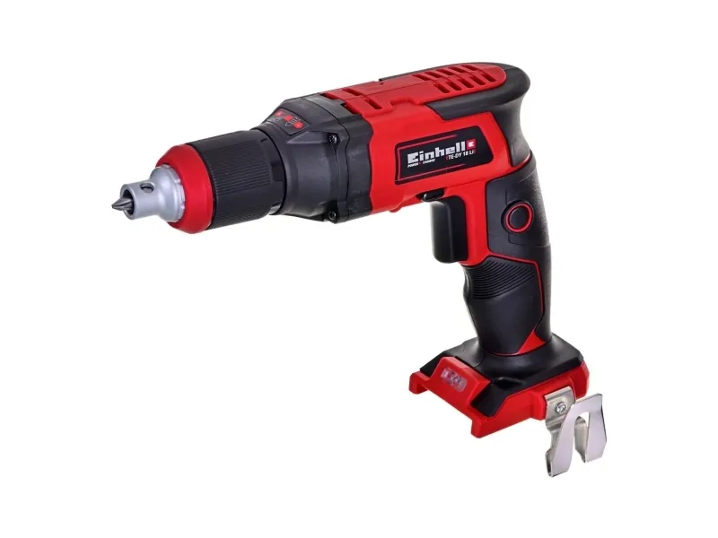 The Einhell TE-DY 18 Li-Solo cordless drywall screwdriver delivers precise and powerful service for renovation and restoration work, with great flexibility far away from the nearest socket outlet. As a member of the Power X-Change family it can be used with all the completely interchangeable rechargeable batteries from the system series. For precise depth setting there is an adjustable depth stop. Low-fatigue operation is ensured thanks to the selectable continuous operation setting. An integrated pressure coupling also contributes to user-friendly screwdriving. The short, lightweight design with ergonomic softgrip surfaces make it comfortable to work with, which the skillful DIY enthusiast will appreciate. Thanks to the LED lighting on the cordless drywall screwdriver, optimum operation in dark areas is no problem either. Bits can be changed quickly and intuitively thanks to the magnetic bit holder (6.35mm/¼"). Also included is a practical belt clip for holding the cordless drywall screwdriver between operations. Supplied in the practical and universal E-Box. The desired Power X-Change battery and the charger are available separately.