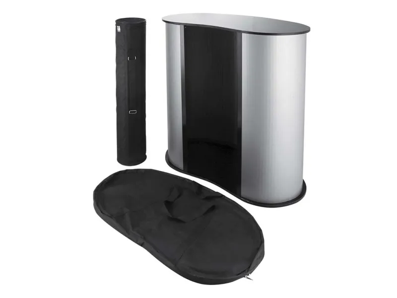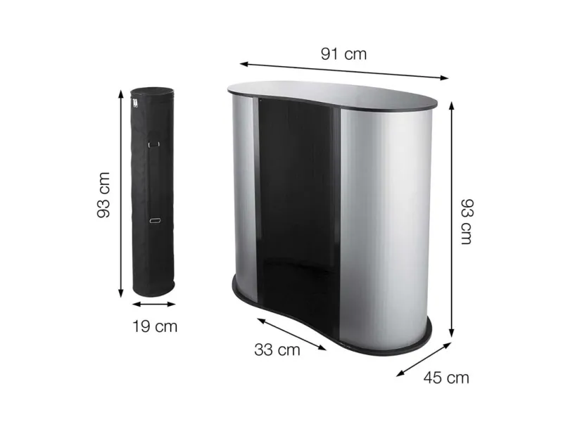 TWIN messebord er et solidt, stilfuldt messe counter, som er vores best seller! TWIN messebordet er super stabil og produceret i høj kvalitet og stærk plast. Den træ bordplade leveres som standard i sort. TWIN diske kommer som standard med praktiske hylde inde i disken. Dette messebord er super praktisk og let at sætte op og transportere ved hjælp af de 2 medfølgende tasker. Den fylder meget lidt ved opbevaring.