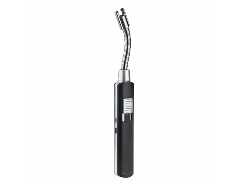 Elektronisk lysbue-stavlighter med fleksibel hals 98.1118.01 Sikker, pålidelig og miljøvenlig med lysbue i stedet for flamme - således tænder man i dag lys, laterner, gaskomber, grill eller kamin. Engangslightere er dårlige for miljøet, ved genopfyldningslightere har man i afgørende øjeblik ofte ingen gas eller benzin ved hånden. Lichtbogen-lighter fra TFA fungerer med elektrisk genereret lysbue og kan nemt og økonomisk oplades via mikro-USB-kabel - på notebook, på pc'en, på Powerbank - præcis som din smartphone. En LED-kontrollampe viser, når batteriet er tomt, og efter 1,5 - 2 timers opladning er det klar til brug igen. Det passende ladekabel er med det samme. Det praktiske apparat har endnu flere fordele i forhold til almindelige lighter: Da det ikke frembringer åben ild, tænder det i vind og vejr som en stormlighter og giver større sikkerhed. Ved at trykke på tasten opbygges lysbuen mellem elektroderne med det samme. En beskyttelsesafdækning forhindrer utilsigtet tænding. Så snart du slipper knappen, men senest efter 10 sekunder, afbrydes lysbuen automatisk. Takket være stavformen kan enheden betjenes sikkert og nemt. Ekstra fleksibilitet får man på grund af den bevægelige hals, der kan justeres efter ønske.