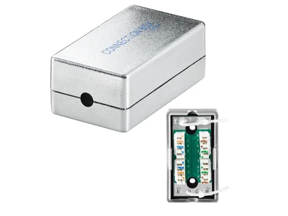 til tilslutning af 2x LAN-kabler, afskærmet, klemliste til værktøjsfri IDC-montering Skærmet CAT-stik (STP) til forlængelse eller tilslutning af 2x LAN-installationskabler Med forbindelsesmodulet kan beskadigede kabler tilsluttes igen uden at skulle omlægge et helt kabelsegment. Egnet til umonterede CAT-5e-netværkskabler med AWG 22-26 Klemrække til værktøjsfri samling ved hjælp af loddefri, skrueløs og afisoleret tilslutningsteknologi (IDC-samling) Maksimal datatransmission på 100 MHz garanterer en fremragende netværksforbindelse med høj ydelse. IDC-stik fremstillet af metalliseret plasthus af høj kvalitet Netværkskabelstikket er egnet til PoE+-applikationer (IEEE 802.3at).
