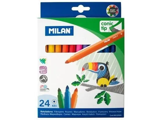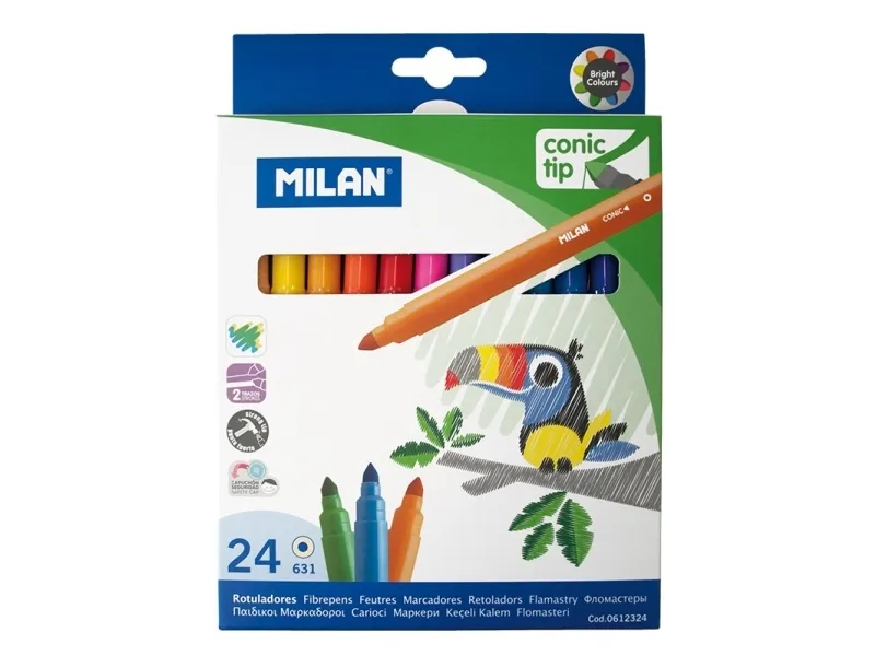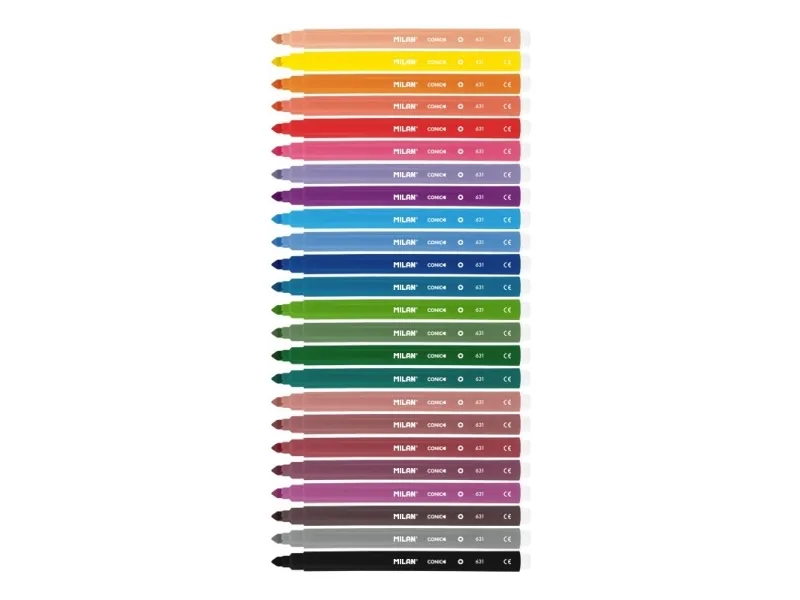 Fibrepens with a 5 mm Ø conical tip. Can be used to create strokes from0.75 mm to 3 mm. Tip is resistant to knocks and pressure. Water-based paint which creates bright, easily-applied colours that can be mixed together. It is best to use this type of tipto fill surfaces with colour. It can be easily washed out of most fabrics (soak the item in cold water for an hour and then machine-wash on a cold setting). With a perforated safety cap. 24 colours.