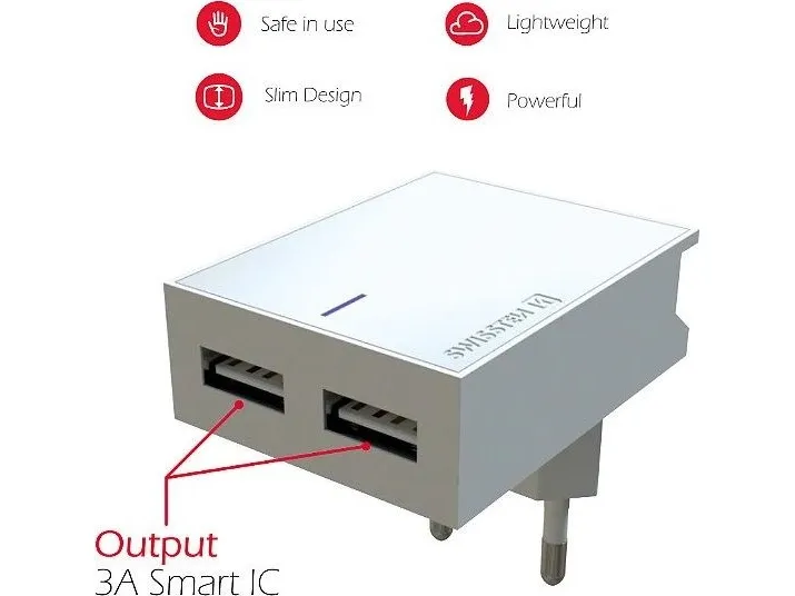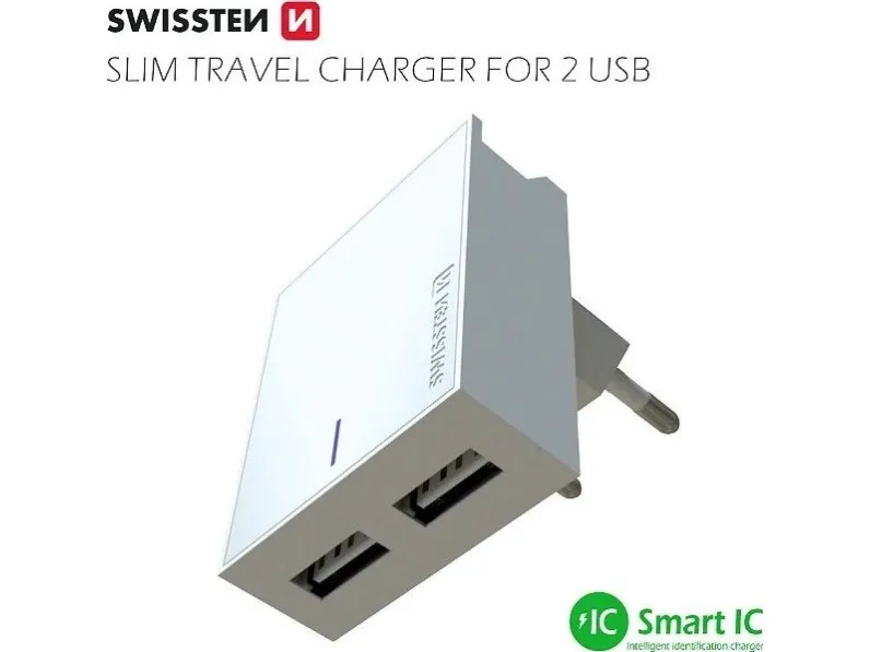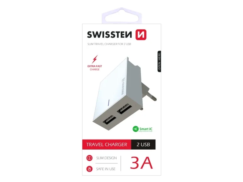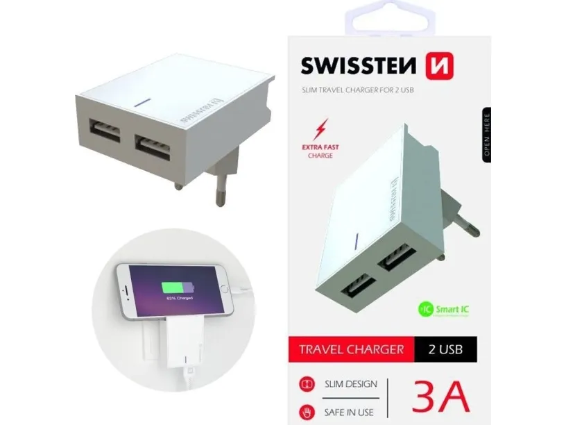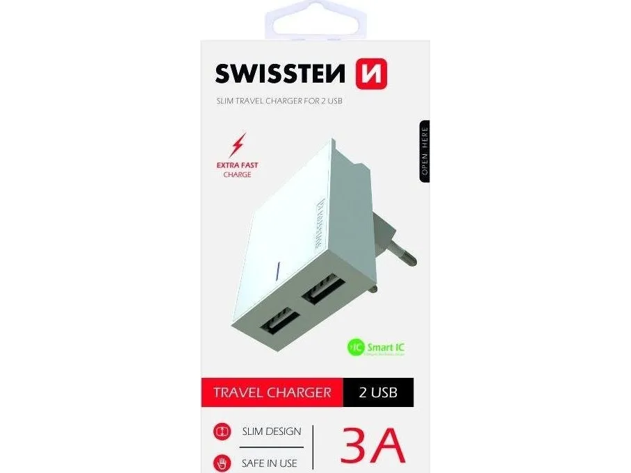 Swissten 22032000. Charger type: Indoor, Power source type: AC, Charger compatibility: Universal. AC adapter output current: 3 A. USB 2.0 ports quantity: 2, Fast charging. Product colour: White