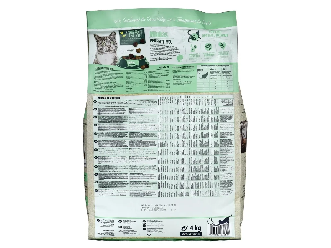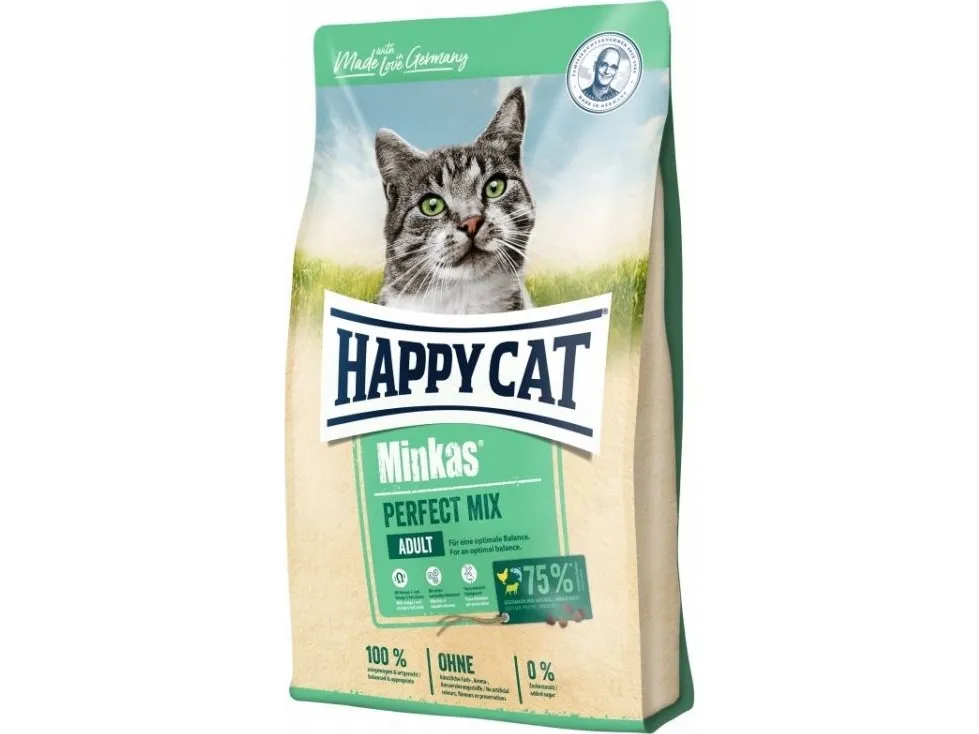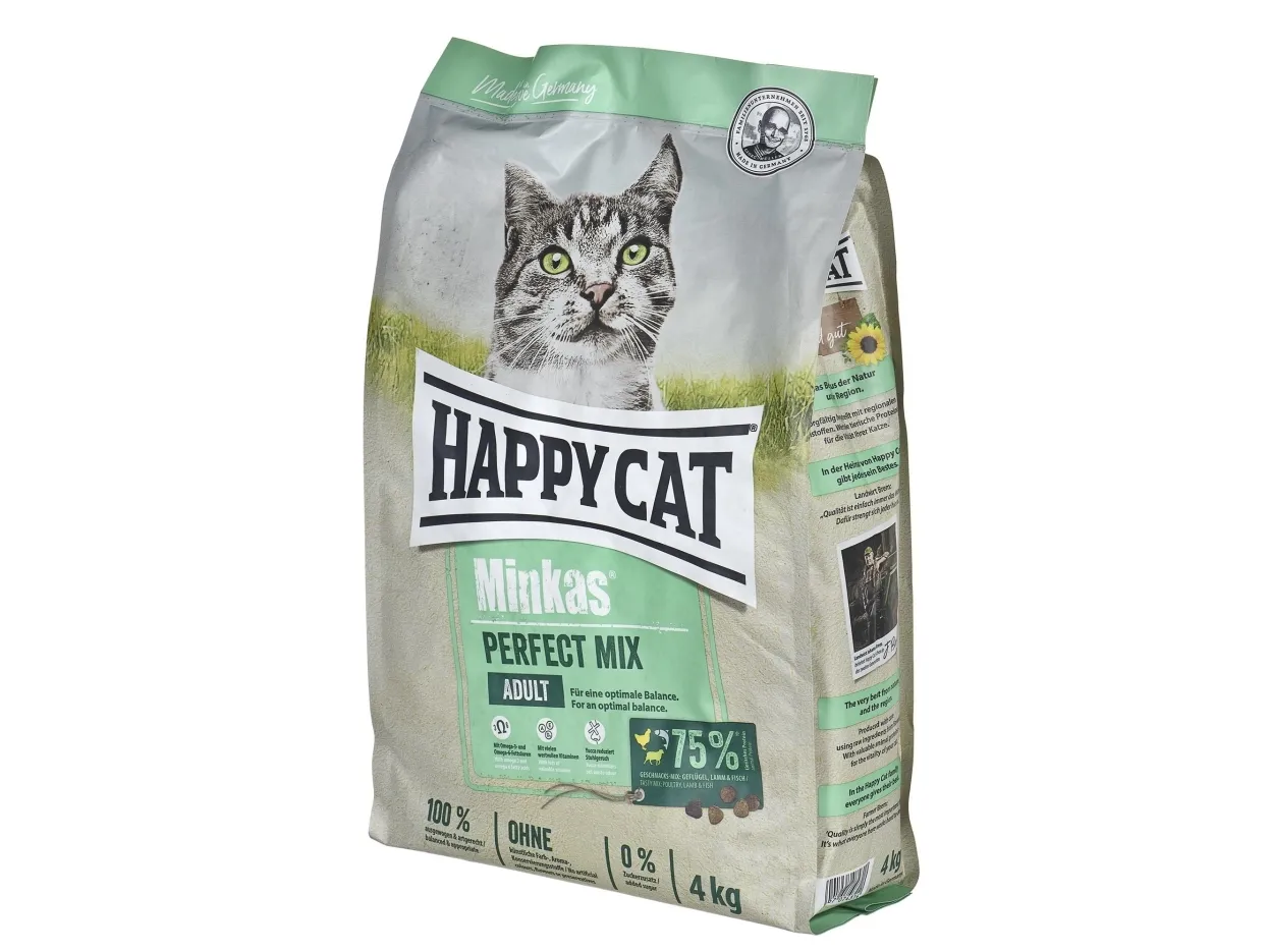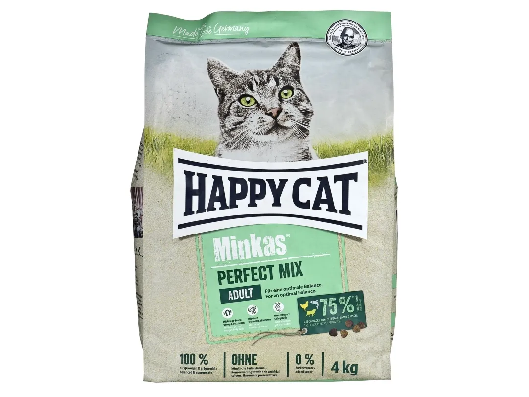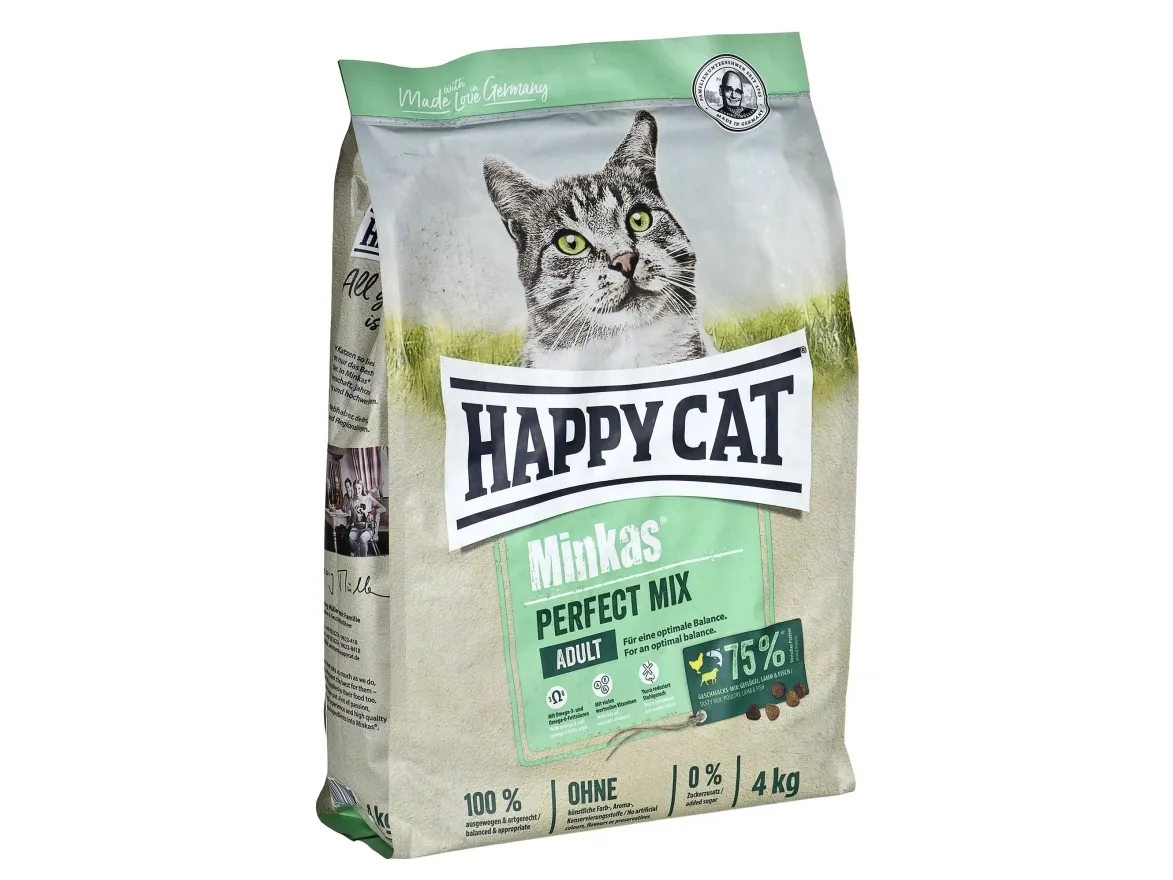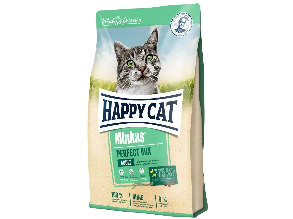 Minkas Perfect Mix For an optimum balance Our Happy Cat Minkas Perfect Mix is a particularly well-balanced complete food for adult cats. With tasty poultry, delicate lamb and delicious fish, this dry food is a real taste sensation for your cat. The tasty biscuit mix is well accepted and extremely well tolerated. Our recipe with its high proportion of valuable animal proteins is 100% balanced and natural. This tasty dry food contains lots of vitamins and minerals to support the immune system. And of course our recipes contain no artificial flavours or preservatives.