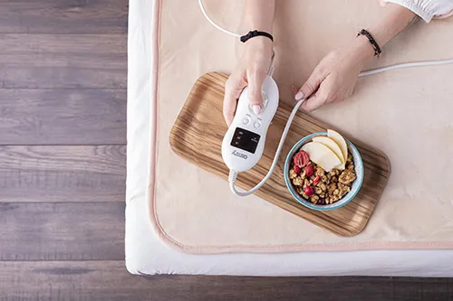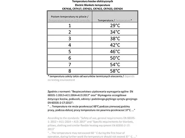 Nom. Power: 60 W. Size: 150x80cm. Washable in 30 C temp. Detachable power cord with LED controller. Timer up to 1,2,10 hours. Made of coral fleece / poliester 8 heating levels. Overheat protection.