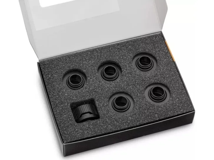 EK-Quantum Torque 6-Pack HDC 16 is a fitting multipack containing six EK-Quantum Torque HDC fittings. These are EK's premium 16mm hard-tube compression fittings designed for use with solid tubing such as Acrylic and PETG. With a non-intrusive, yet striking look, and with NO added branding at all. They can be complemented by interchangeable aesthetic color rings, and are an ideal choice for anyone and a perfect match with EK-Quantum series products. To make sure they are undamaged in transport, they are packed in a box cushioned in black foam.