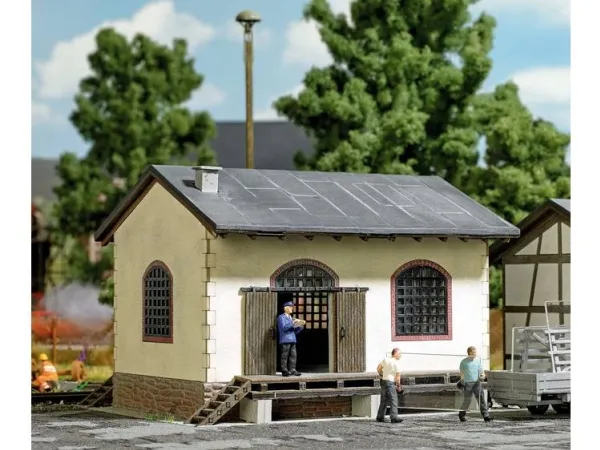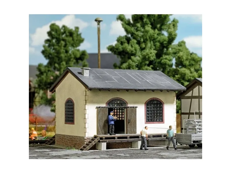 H0 Lille pakhus Byggesæt til et pakhus med læsseramper og skydedøre på siderne. Portene kan monteres i åben og lukket tilstand. Godrampe af ægte træ, realistisk gengivelse af naturstensfatning. Alle dele er færdigkoleret. Kan belyses med Busch LED'er 5998.